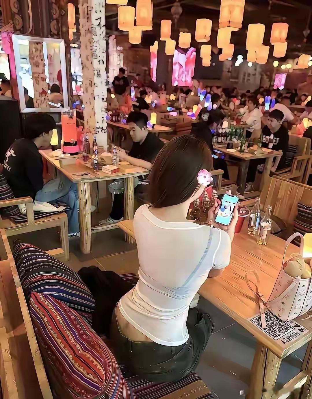 夜晚的酒吧,霓虹灯下,她独自享受着手机时光。