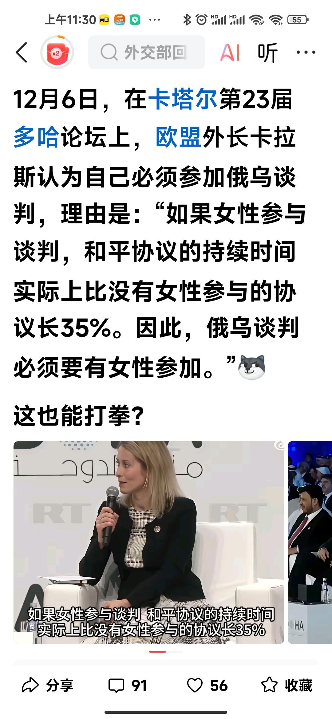 嘿,这欧洲第一傻简直是喜剧界隐藏的“奥斯卡影帝”啊,就像一颗行走的搞笑炸弹。俄乌谈判她非得掺和一脚,理由居然是她是女人,还说女人参与能让和平延长百分之三十五,这就好比说往火里撒把盐能灭火一样荒谬。可别忘了,俄乌战争里这几个欧洲女人就像战争火药桶的“点火员”,那功劳可大着呢! 冯德莱恩,还有三傻之一卡拉斯、莫盖里尼,再加上美国女人纽兰,那可都是罪魁祸首。这几位,哪个不是“老狐狸”,能轻易让人省心?