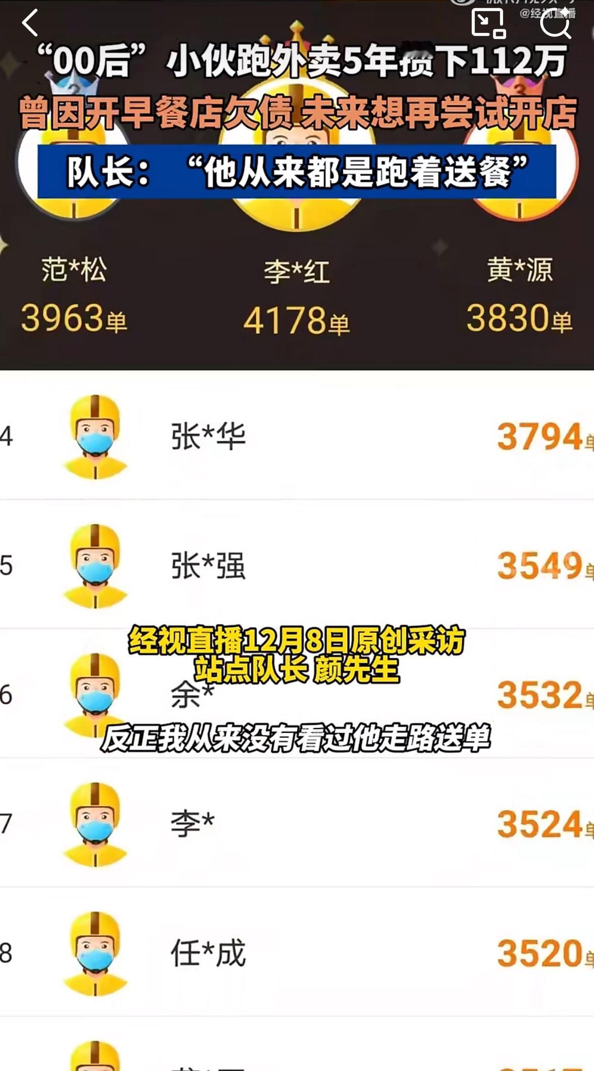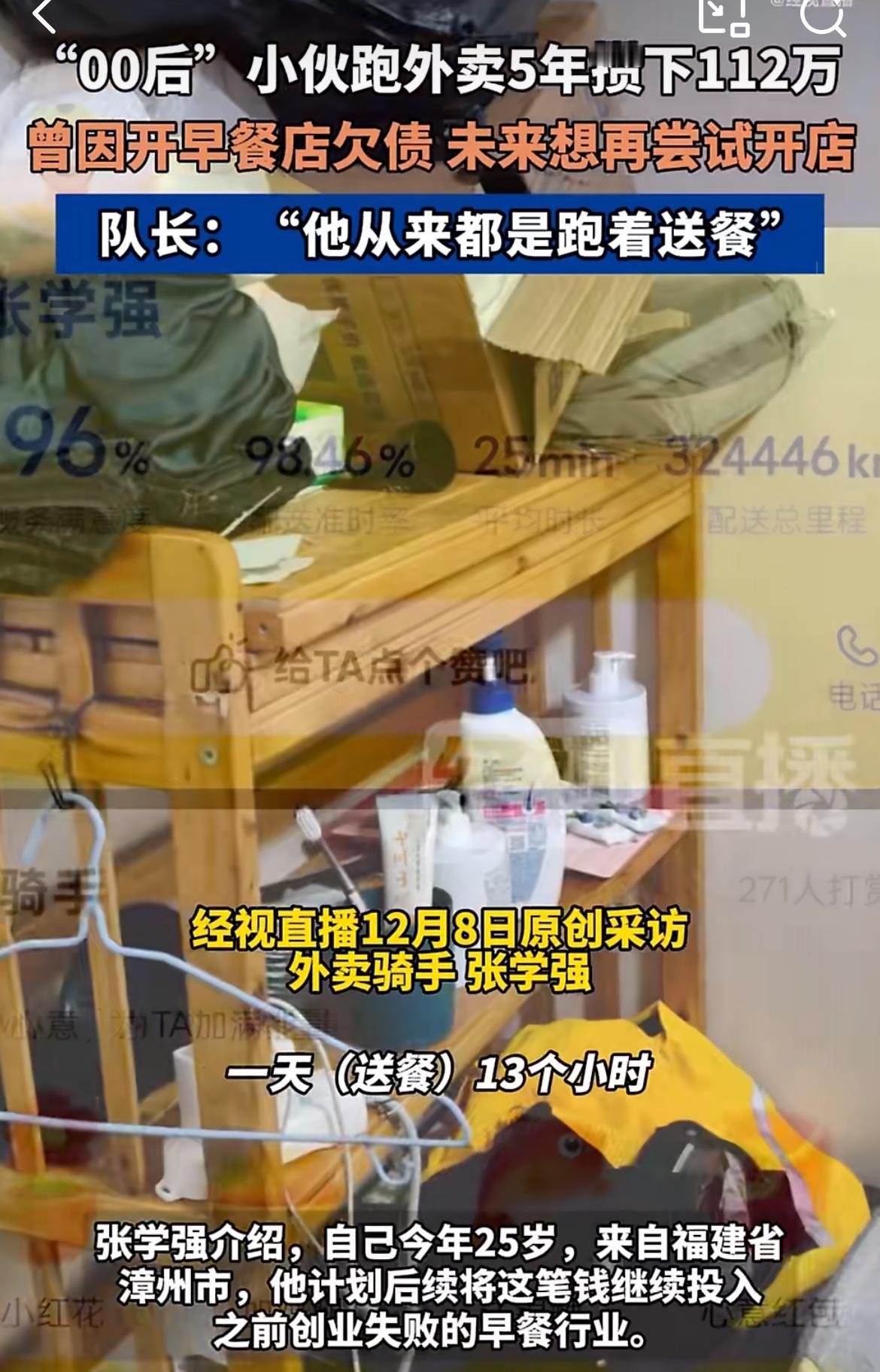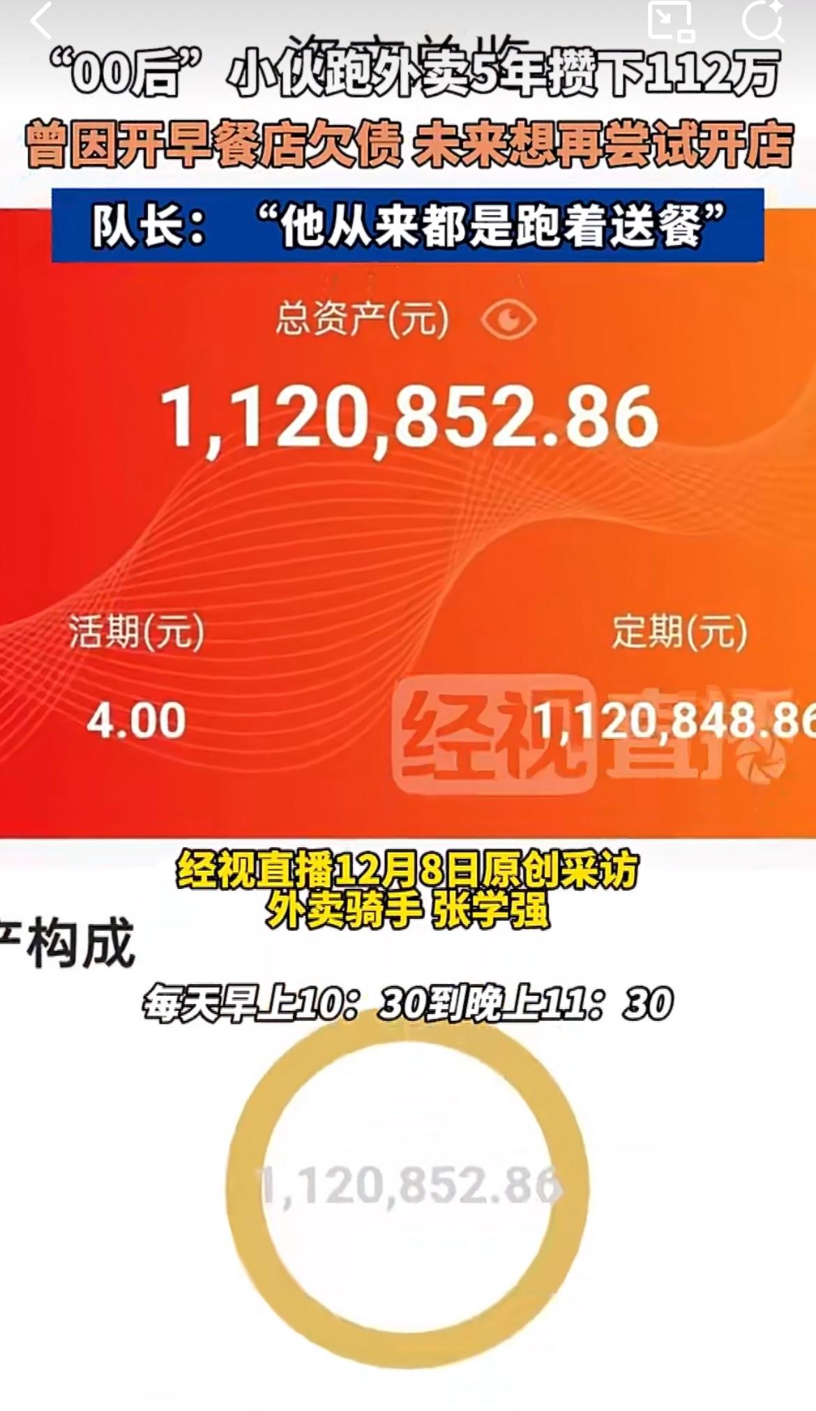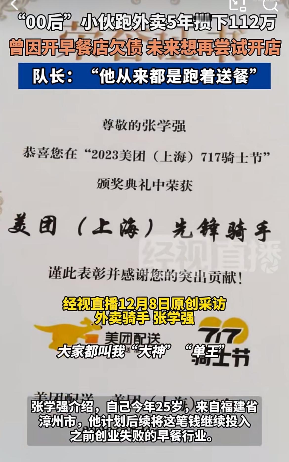 00后上海跑外卖5年挣了140万,某团又在造神,外卖骑手张学强,所有跑外卖的都记住你了,你牛逼吹大了。这个来自福建漳州的小伙,一共跑了5年,扣除开支,存了112万。就算一个站点把所有的单子都给他跑,不眠不休都不可能做得到。每天需要800块的流水,至少200单,现在的环境还有这么多单吗?现在的外卖骑手都严重过剩了,哪里还有那么多单给你跑。外卖从业者收入 餐饮人美团外卖