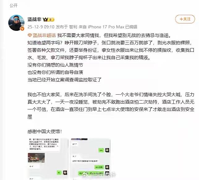 劫匪还是讲点道义的,只要财不索命,开口是300达布溜,没多要,也没临时加价,可见行事之周密,行动之迅速,明显有狗头军师在指挥。蓝战非应该庆幸没落在缅北,否则就不是失财的问题,从里到外会被吃个一干二净,不幸中之大幸,舍财保命。 吃一堑长一智吧,网红赛道虽好,帮人保管钱财就不好玩了,该收心了。