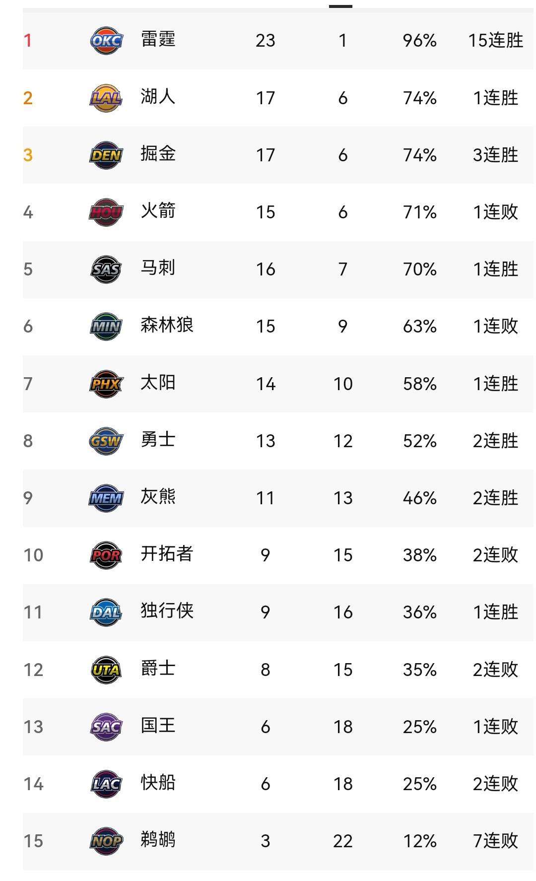 此轮比赛太精彩,看NBA最新西部排名 NBA新一轮赛事全部结束,此轮比赛可谓精彩纷呈,让球迷大饱眼福。 一是西部排名倒数第一的鹈鹕主场迎战西部排名第五的火箭。目前鹈鹕3胜21负,马刺15胜7负,二者胜率悬殊较大。此场比赛上半场结束,鹈鹕57:77落后马刺20分,最多一度落后到25分,但第三节鹈鹕绝地反击,单节45:23净胜马刺22分,完成反超。第四节战至最后30秒鹈鹕132:131领先马刺1分,可惜最终功亏一篑以132:135落败,险些完成惊天大逆转。 二是排名第七的太阳客场挑战排名第六的森林狼,二者妥妥的卡位之战。双方实力相当,竞争异常激烈,三节战罢,84:84平分秋色。末节开局太阳连得7分获得领先优势,森林狼一路追赶,最后8.9秒,105:106落后太阳1分,全场比赛结束,太阳108:105险胜。 三是残阵勇士与公牛之战。此役库里、格林、霍福德等主力球员缺阵,勇士全场领先,123:91以32分的优势获胜。勇士10人上场10人全部得分,其中6人得分上双。 另外灰熊胜开拓者,掘金胜黄蜂,湖人胜76人,雷霆胜爵士,而国王不敌步行者。 此轮之后,西部排名前三的队伍依次为雷霆、湖人和掘金,其胜率为96~74%;排名4~6名的队伍依次为火箭、马刺和森林狼,其胜率为71~63%。 位于季后赛附加赛区内,排名第7~10的四支队伍依次为太阳、勇士、灰熊和开拓者,其胜率为58~38%。 排名第11~15名的队伍依次为独行侠、爵士、国王、快船和鹈鹕,其胜率为36~12%。
