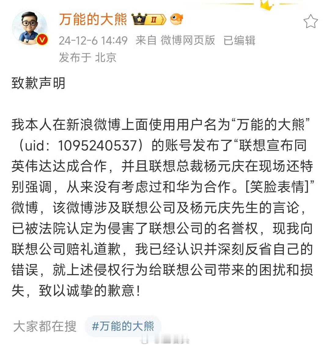 我和熊老师一样,都在蹭陈震话题的流量,不过熊老师蹭得更不要脸一些。熊老师先是设定一个和陈震是哥们儿的身份,震哥了不起、震哥威武,好话都被熊老师说了。为什么要这么说?自然是为了攀关系,毕竟陈震的生态位高太多了,可以直接和两位大佬在直播间讲解技术。不光熊老师想攀上这层关系,很多自媒体博主都想攀上这层关系,这也是有依据可循的。但随着陈震偷税被查,人设崩塌,熊老师切割起来也是极为卖力的,这两天一直在进行切割。从震哥到陈震,又从陈震到我不认识陈震,现在直接被熊老师打成了米粉陈震。其实熊老师真就没接触过陈震,陈震也压根就没搭理过熊老师,别看熊老师一口一个震哥了不起、震哥威武,实际上陈震从未回复过他,陈震的微博,从未圈过熊老师。这就挺尴尬的,熊老师攀关系这么久,结果陈震压根就没搭理过熊老师,难怪着急搞切割。说真的,我也希望熊老师最终是像陈震那样,倒在税务问题上,希望熊老师真的有税务问题吧!如果不是倒在税务问题上,那就大概率要倒在“联想起诉熊老师”这类问题上,是要赔钱的,希望熊老师到时候能赔得起。
