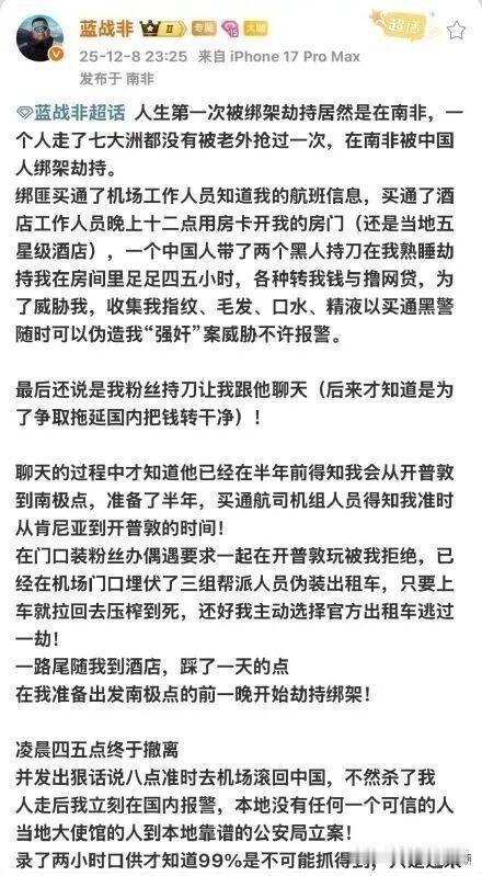 蓝战非南非被劫资产恐难追回… 2025年12月,千万粉丝网红蓝战非在南非开普敦遭遇持刀绑架,被胁迫转账、借贷,涉案资产数额不菲。结合案件细节、南非司法环境及跨境资产追索规律来看,被劫资产几乎无追回可能,核心困境集中在犯罪手段专业性、加密货币技术壁垒与跨国司法协作障碍三大层面。 下面就从四个方面进行一下分析,嫌字多的可以绕过。 从犯罪链条设计来看,绑匪的“反追索”准备从源头切断了资产追回路径。在索取财物时,绑匪不仅逼迫蓝战非清空银行账户、申请网贷,更倾向于通过加密货币完成资金转移——这一选择直指资产追索的核心难点。加密货币的匿名性、去中心化特性,使其无需依赖传统金融机构即可跨境流通,一旦完成“混币”操作或转入匿名钱包,链上资金轨迹便会被彻底掩盖。南非此前在MTI比特币诈骗案中已暴露短板,即便法院介入清算,也因缺乏完整账簿和客户信息,无法追踪23000个比特币的流向,此次蓝战非案件中,绑匪显然借鉴了这类犯罪的“成熟经验”。 从技术与司法协作层面看,资产追回面临双重“时间差”困境。一方面,加密货币追索的关键在于“即时冻结”,需在资金转移初期通过国际司法协作,要求交易所配合拦截。但蓝战非被绑架长达4-5小时,绑匪有充足时间完成多轮资金转移,等其事后报警时,资产早已脱离初始账户。另一方面,跨国司法协作的繁琐流程进一步放大了“时间差”。中国与南非虽可启动刑事司法协助,但需满足“双重犯罪”原则,经由司法部、最高检等中央机关层层对接,仅文书认证、流程审批就需数月。而根据过往案例,此类案件中资产平均在72小时内会被转移至3个以上国家的匿名账户,等协作程序启动,资金早已被拆分、洗白,南非警方直言“99%抓不到人”,本质是对这种司法效率与犯罪速度落差的无奈承认。 此外,南非本地治安与司法资源的局限性,进一步压缩了资产追回空间。公开信息显示,南非平均每三天就发生一起绑架案,年末假期案件高发,警方精力分散,且存在“黑警与犯罪集团勾结”的隐患——绑匪甚至收集蓝战非的毛发、精液等生物信息,威胁“伪造强奸案栽赃”,侧面印证了当地司法环境的不可靠性。更关键的是,南非司法系统缺乏追踪加密货币的技术能力,此前MTI诈骗案中,28000名投资者的7.4亿美元比特币资产至今无法追回,清算人连完整资金账簿都无法获取,足以说明其在复杂金融犯罪面前的应对乏力。对于蓝战非案件,当地警方立案更多是“备案防栽赃”,而非主动追查资产,这种司法态度从根本上断绝了资产追回的可能。 从跨境资产追索的普遍规律来看,此类案件的“追赃难”早已是全球性难题。人民网相关分析指出,跨国追赃中“追赃难于追人”,即便抓获嫌疑人,涉案资产也常因被挥霍、转移或认定困难而无法追回。加之不同国家对“赃物”的法律定义存在差异,例如部分国家不认可加密货币为“可追索资产”,即便中国法院判决追缴,也可能因资产流入国法律限制而无法执行。蓝战非的遭遇并非个例,它暴露的是全球化背景下,个人面对专业化跨国犯罪时的脆弱性——当犯罪集团能熟练利用法律差异、技术漏洞设计“反追索”方案时,普通受害者的资产安全几乎无从保障。 综上,蓝战非被劫资产的追回,既缺乏技术层面的“即时拦截”条件,又受限于司法协作的效率短板,更面临南非本地治安环境的先天不足。对受害者而言,“人安全归来”已是最优结果,而被劫资产的“沉没”,则是当前跨国犯罪治理中技术、法律与执行能力失衡的必然结果。