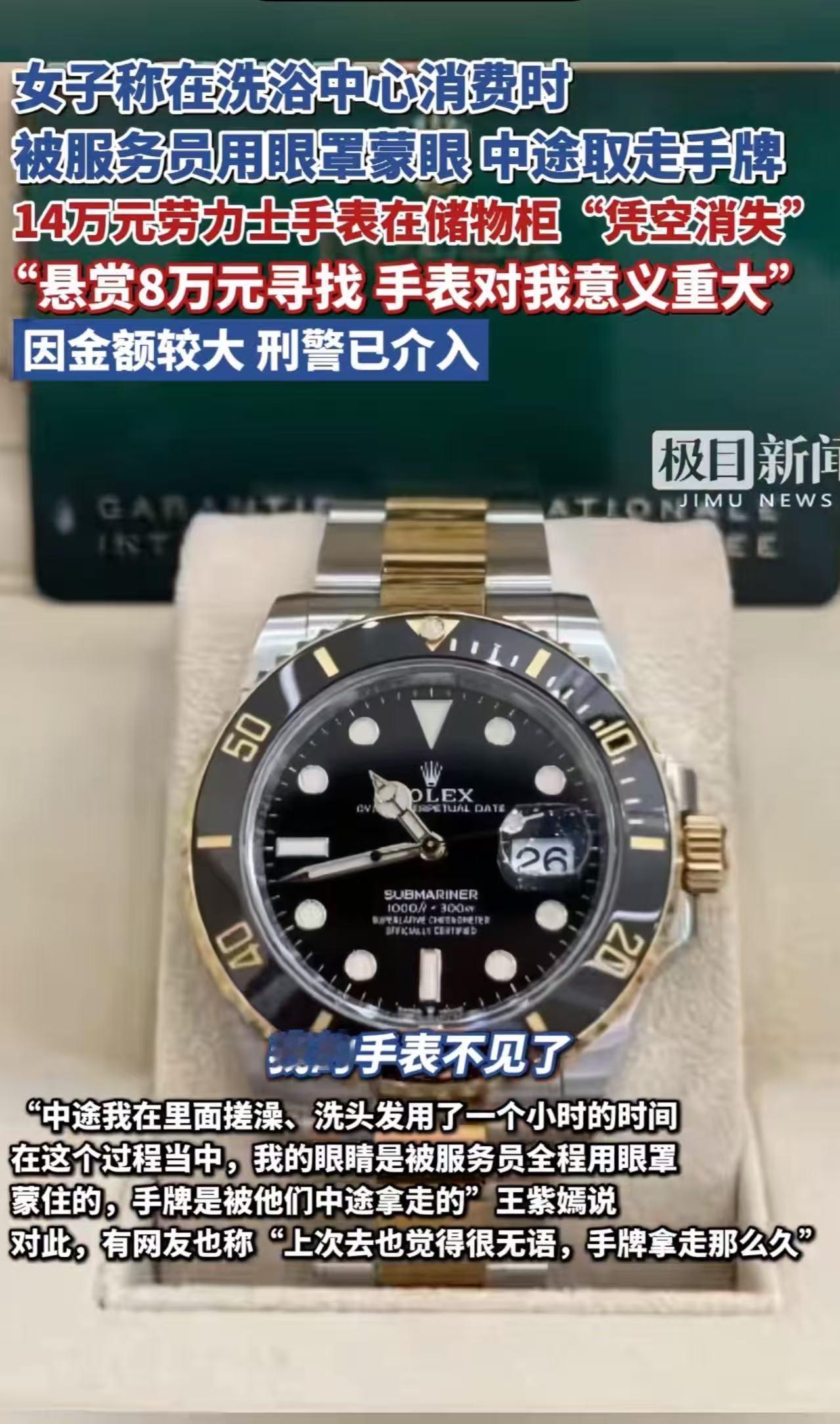 12月1日北京,一女子花2600元,和朋友去洗浴店洗澡,她洗完竟发现,自己的价值14万劳力士手表不见了,而柜子没撬动痕迹,女子心里咯噔一下,她怀疑自己搓澡时,服务员蒙住了她的眼睛,然后悄悄拿走了她的手牌,把劳力士偷走了,女子悬赏80000元想找回自己的手表。没想到洗浴店竟然先报了警。网友:不用蒙眼,打开你的柜子,不用你的手牌。 12 月 6 日上午,北京潘家园二手钟表市场,民警老李拿着照片问商户:“见过这款劳力士吗?表带刻着‘2023.10’”。 商户摇头:“最近没见这么贵的,14 万的表,进货得登记。” 这桩洗浴店失窃案,已过去 5 天仍没头绪。 12 月 1 日中午,王女士从河北涿州来京,和朋友直奔那家网红洗浴店。 2600 元的套餐里含搓澡、汗蒸,她想着 “贵点安全,犒劳自己”。 手腕上的劳力士是妈妈送的本命年礼物,表带刻着她的生日。 进更衣室时,前台姑娘提醒:“贵重物品可以寄存,有专门保险柜。” 王女士摸了摸手表:“我锁电子柜里就行,一会儿就洗好。” 她选了最里面的柜子,按指纹锁时特意看了眼 —— 锁芯亮绿灯。 朋友先去洗浴区,临走前扯她袖子:“手牌别给别人,我上次在别的店见过丢东西的。” 王女士点头:“知道了,我揣浴袍口袋里。” 可半小时后搓澡时,3 号服务员的话让她松了戒心。 “姐,您这手牌放口袋里怕沾水坏了,我帮您收着吧?” 服务员递来热毛巾。 王女士起初没同意:“我自己拿着就行。” 服务员又说:“一会儿搓后背,您抬手容易掉,我放旁边置物架,离您近。” 王女士闭着眼点头,没看见服务员把手牌塞进围裙内侧。 搓澡的 40 分钟里,她听见两次柜门响动,以为是别人取东西。 直到洗完澡去拿表,电子柜打开的瞬间,她攥紧了浴袍 —— 首饰盒空了。 “我的表呢?” 王女士声音发颤,朋友赶紧跑过来帮着翻找。 洗浴区的置物架、垃圾桶、汗蒸房角落,都没手表的影子。 找店长理论时,对方第一句话是 “您确定锁好了吗?” 12 月 1 日傍晚,洗浴店先报了警。 民警调取监控,只见王女士 12 点 15 分戴表进店,之后洗浴区没监控。 更衣室的监控只拍得到过道,拍不到柜子前的动作。 刑侦人员查电子柜:没撬动痕迹,指纹只有王女士和清洁员的。 清洁员说 “我只擦柜子外面,没碰过里面”。 问 3 号服务员,对方说 “我没拿她手牌,她洗完我就去换班了”。 12 月 3 日,王女士找律师咨询。 律师指着《消费者权益保护法》第 18 条:“洗浴店没尽到安全保障义务,备用钥匙没备案。” 当天下午,洗浴店贴出整改通知:洗浴区加装监控,备用钥匙需双人登记。 12 月 5 日凌晨,王女士在抖音发悬赏视频。 视频里,她举着购买发票:“8 万赏金,找表或线索都算,表对我很重要。” 当天就有 3 人联系她,其中两人发的照片根本不是她的表。 12 月 6 日,民警排查了 5 家二手钟表店,都没发现线索。 王女士每天刷社交平台,手机里存着 3 号服务员的工牌照片。 警方说 “还在查服务员的行踪,她当天提前 15 分钟下班”。 洗浴店最近客流量少了三分之一,点评区有人留言:“不敢去了,手牌都能被拿。” 店长主动联系王女士:“愿意先赔 3 万,等案子破了再找嫌疑人要。” 王女士没同意:“我要的不是钱,是把表找回来。” 现在,王女士出门总摸手腕,空落落的感觉让她难受。 民警说 “二手市场管控严,表很难脱手,再等等”。 她把悬赏视频置顶,签名改成:“盼着手表能回来,那是妈妈的心意。” 信源:北京一女游客洗浴时14万元劳力士手表从储物柜消失,悬赏8万元寻找,警方已介入 2025-12-05 18:29·红星新闻