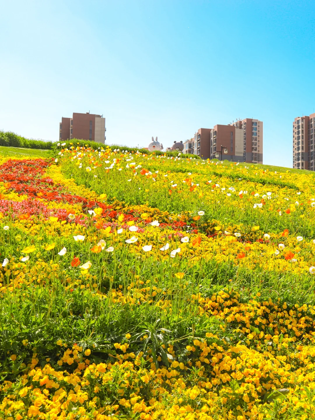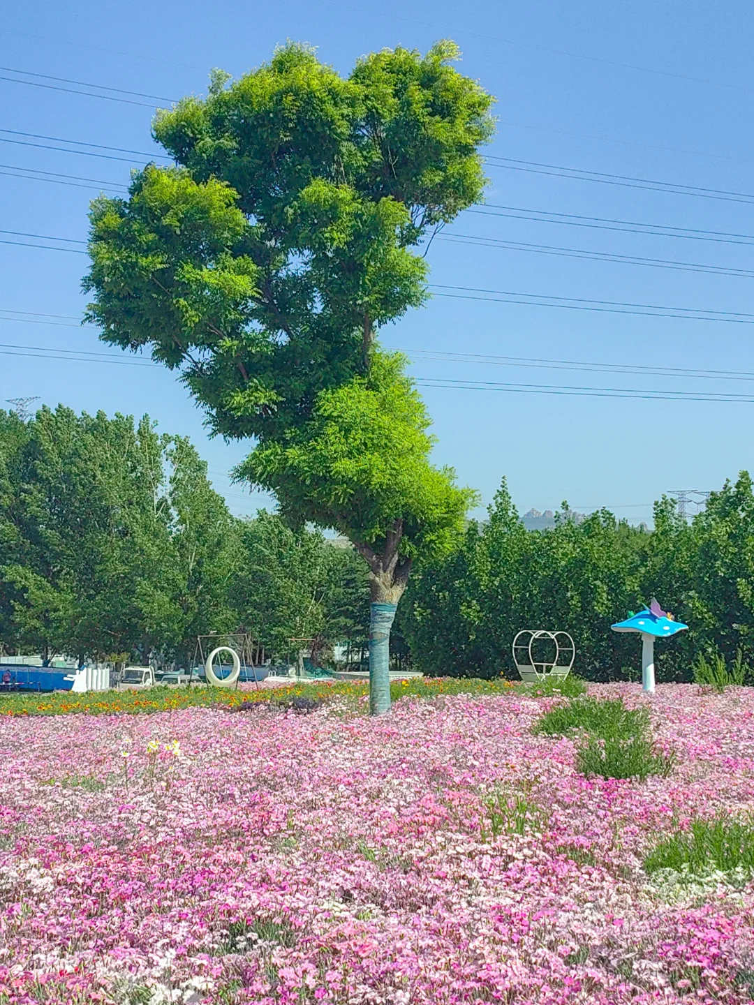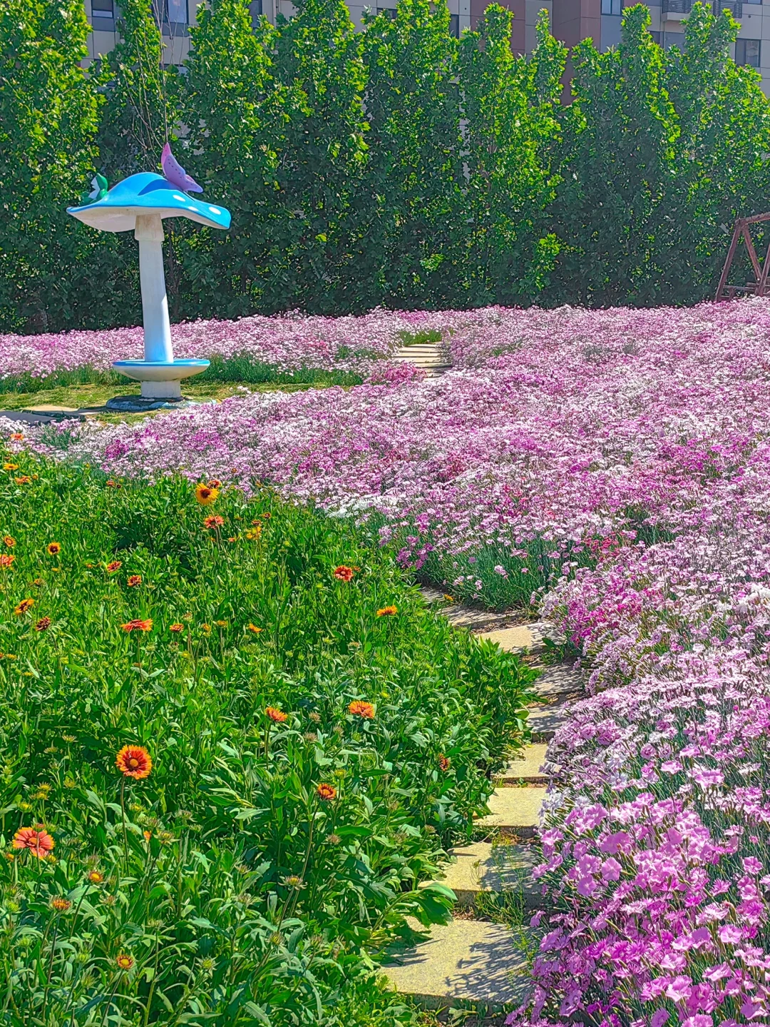 浪漫生活的记录者 青岛好玩有好看的公园 在这里 花海➕游乐场 . 🌳青岛宁城路和文阳路路口,车停在路边 👉一整片的花海,芝樱花➕小雏菊➕马鞭草➕虞美人,很多花还没有盛开,所以花期预计很长 👉小型游乐场,滑梯➕秋千➕转盘➕跷跷板,小朋友在这里顶着太阳玩了中午,唯一的缺点就是没有遮阴的地方 👉建议下午去光线比较柔和,也没那么晒哦 👉附近就是白沙河运动公园,2公里左右,很近,可以一并打卡