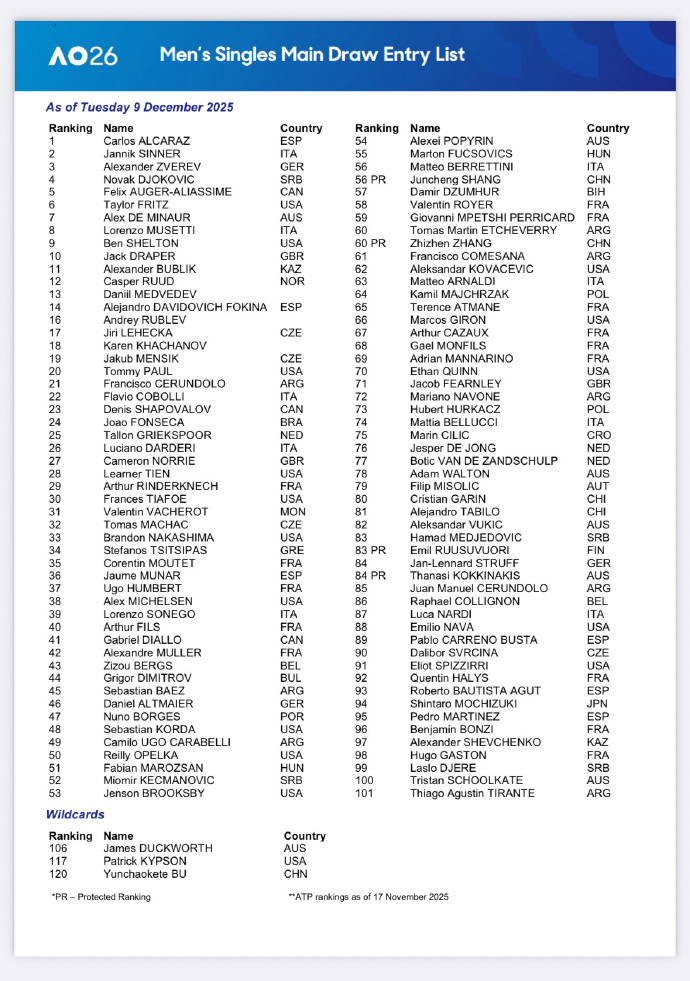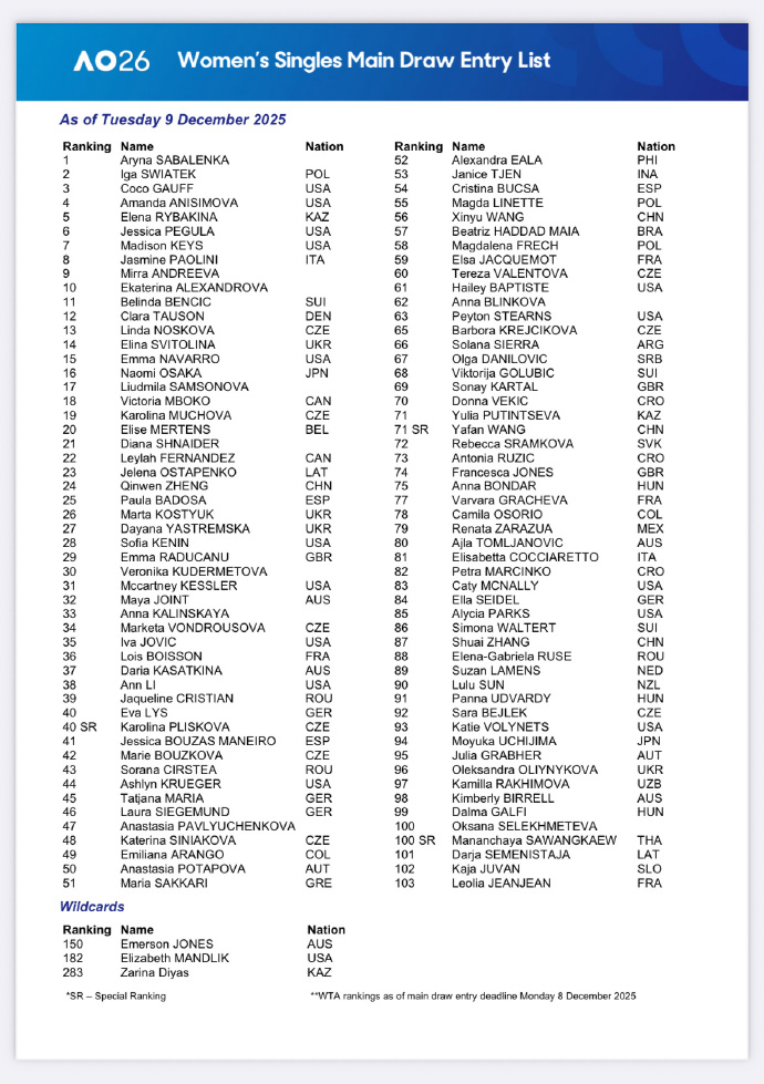 中国七人入围澳网单打正赛 2026澳网正赛名单公布,7位中国选手在列,郑钦文领衔:女单:郑钦文、王欣瑜、王雅繁(保护排名)、张帅男单:商竣程(保护排名)、张之臻(保护排名)、布云朝克特(外卡) 澳网2026 单打完整参赛名单见图8-9