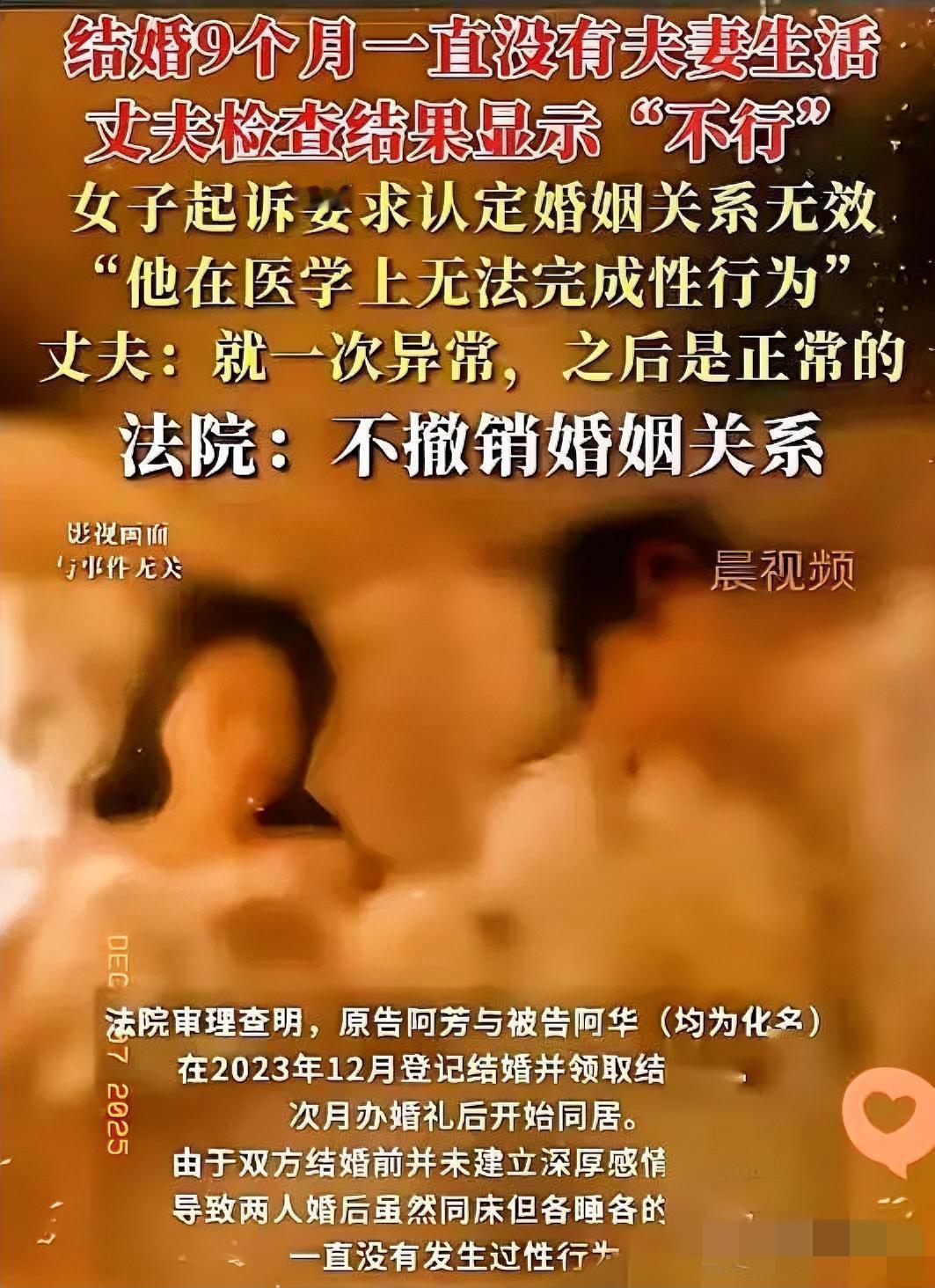 湖北一女子经相亲与一男子结婚,谁知,结婚都9个月了,男子都不碰妻子, 妻子认为男子“不行”,拉着他去做检查,结果检查发现男子“医学上无法完成性行为”,妻子上诉离婚,法院的判决让人意外! 这哪里是组建家庭,分明是用婚姻当幌子的恶意欺骗!3个月闪婚的速度,藏不住男方刻意隐瞒关键健康信息的自私。别扯什么“隐私”,性生活是婚姻里最核心的实际需求,这种关乎终身幸福的事藏着掖着,比出轨还毁人信任。 你说这女的得多窝火啊。相亲时候看对方老实巴交,说话也挺靠谱,三个月觉得差不多就嫁了,谁能想到是这么个坑。白天一起吃饭,晚上各睡各的,刚开始还劝自己“可能人家慢热”“尊重女性挺好”,时间长了,亲戚朋友问“啥时候要孩子”,那脸往哪儿搁? 换作是咱,夜里躺床上不得翻来覆去睡不着?明明是夫妻,过得比陌生人还生分。主动点吧,人家躲躲闪闪;问急了吧,就说“太累了”“身体不舒服”,那谎话编的,估计自己听着都心虚。九个月啊,一天两天能忍,大半年下来,那心不就凉透了? 最气人的是这男的,明知道自己有这毛病,还敢往婚姻里钻。是觉得结了婚就能蒙混过关?还是压根就没把女方当回事,只想着找个人搭伙凑个数?这哪是过日子,这是把人坑进来当摆设啊。 相亲不就图个坦诚吗?你说你收入低点、家里负担重点,只要说清楚,人家愿意就行。这种关乎一辈子的事儿藏着掖着,跟拿着刀子骗人有啥区别?女方从期待到怀疑,再到最后心死,这过程得多煎熬? 听说法院判决还挺意外,没撤销婚姻关系。这就让人想不通了,这种明摆着的欺骗,难道还能算“感情没破裂”?那以后谁还敢相亲结婚啊,万一再碰上个藏着掖着的,这不耽误一辈子吗? 身边有个姐们儿,相亲时男方主动说自己有轻微糖尿病,得注意饮食。当时觉得这男的实在,后来俩人结婚,互相照顾着控糖,日子过得挺好。你看,坦诚点多好,非要耍小聪明,最后坑了别人,也把自己名声搞臭了。 婚姻这东西,最忌讳的就是藏心眼。连最基本的坦诚都做不到,还谈啥相濡以沫?希望这女的能早点解脱,也给所有人提个醒:结婚前该问的就得问清楚,别不好意思,不然真掉坑里,哭都来不及。 各位读者你们怎么看?欢迎在评论区讨论。