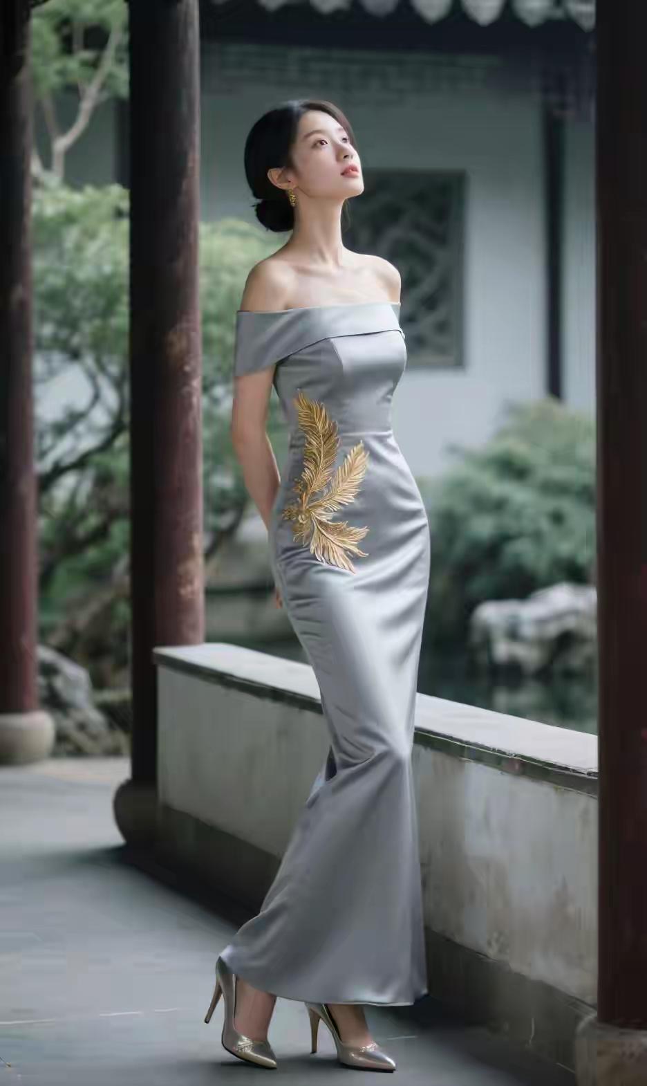 优雅东方韵,金色叶刺绣裙,韵味十足