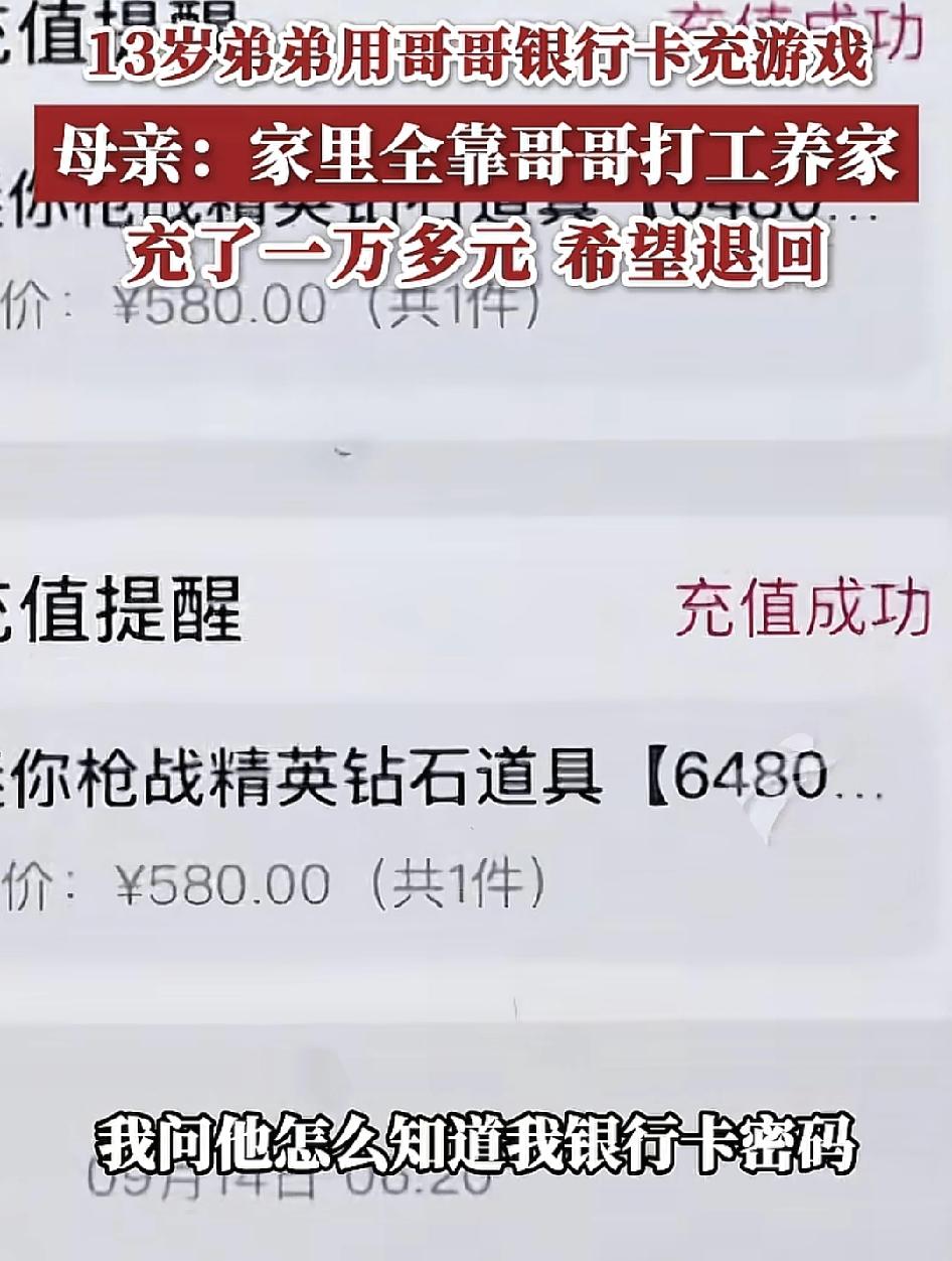 广东韶关一男子称其弟弟偷拿自己的手机充值游戏账号,花掉1万多元。男子说去年的时候弟弟就偷拿自己的手机充值游戏一共600块钱,当问弟弟怎么知道自己的密码的时候,弟弟说是猜到的,弟弟用自己的手机去注册账号,父母称全家都靠哥哥一个人养家,1万块对于普通的家庭来说就是巨款,现在已经向平台提出申诉,希望把充值的钱退回来。平台第一时间给出的回复是成年人的账号充值的钱无法退款,不过已经把情况交给专项小组来跟进。