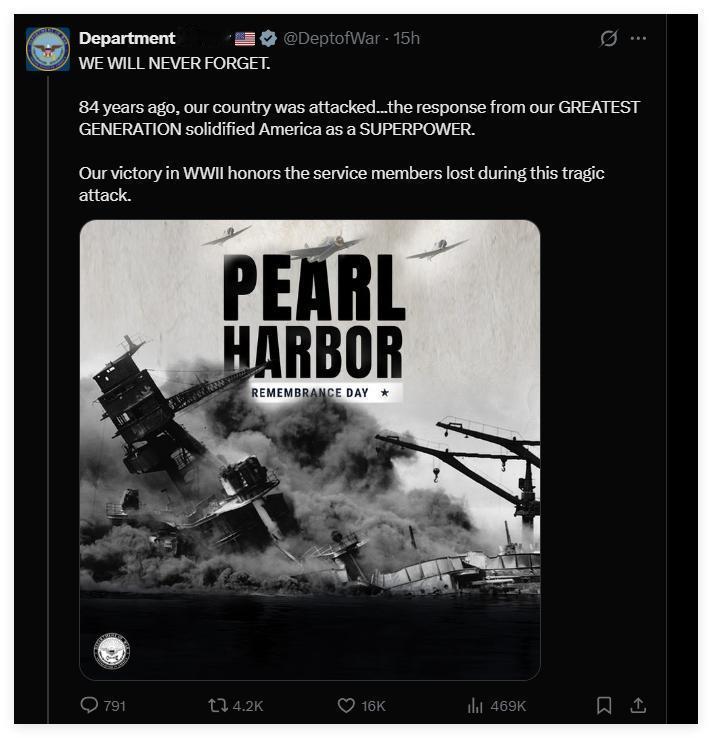 刚换上 “战争部” 新名的美国国防部,在官方账号晒出珍珠港遭袭 84 周年纪念海报,配文标注 “我们永远不会忘记”。可整段帖子翻下来,从头到尾没点明当年偷袭珍珠港的始作俑者到底是谁? 大伙儿点开海报仔细一看,除了简单的缅怀文字,全程没提半个字关于谁发动了那场袭击。要知道,珍珠港事件可是改变二战走向的大事,当年的袭击让美国彻底卷入战争,现在突然不提凶手,实在让人摸不着头脑。 更离谱的是,海报上标注的 “袭击机群” 里,居然混进了美国自己的TBF轰炸机,懂行的网友一眼就指了出来,这可是最基础的军事常识错误。 可能有人还不知道,发布这张海报的 “战争部”,几个月前还叫美国国防部。2025 年 9 月,美国政府通过行政令把名字改了回来,说是 “国防” 这个词太温和,不符合当下的军事战略,改叫 “战争部” 更能体现进攻性和威慑力。 名字刚换没几个月,就遇上了珍珠港纪念日,原本该是严肃缅怀的时刻,却因为海报上的两个问题引发了轩然大波。 回溯到 1941 年 12 月 7 日,日本海军突然对美国珍珠港海军基地发动突袭,整个袭击持续了两个多小时。那次事件中,超过两千四百名美国军人和平民遇难,大量战舰和战机被摧毁。 这件事在美国历史上留下了深深的烙印,过去八十多年里,每到纪念日,美国官方都会明确提及日本是袭击发动者,提醒民众铭记这段历史。 可这次不一样,刚改名的战争部偏偏在关键信息上含糊其辞。社交平台上的网友们炸开了锅,留言区里全是追问 “到底是谁发动的袭击”。 有网友翻出往年的纪念资料,对比之下更觉得奇怪,以前的官方声明、海报都会清晰点明历史事实,从没像这次这样遮遮掩掩。甚至有国外网友调侃,难道是刚改名太忙,连历史事实都忘了核对。 让人意外的是,面对全网的质疑,美国战争部始终没有回应。既没解释为什么不提袭击者,也没就配图错误道歉。 倒是白宫当天发布的纪念公告里,说法有些矛盾,既承认了当年是日本帝国发起的袭击,又特意强调现在美日是 “亲密盟友”,这种前后不一的表述,让争议变得更大。 更值得注意的是,84 周年的这次纪念,是首次没有珍珠港事件幸存者出席现场仪式。随着时间推移,亲历者越来越少,官方的历史叙事对公众尤其是年轻一代的认知影响越来越大。 如果连官方都刻意模糊关键信息,年轻一代可能慢慢就不清楚珍珠港事件的完整真相,这段重要的历史记忆也可能逐渐淡化。 背后的原因其实不难猜测。这些年美国和日本的军事合作越来越紧密,2024 年两国还调整了军事指挥体系,驻日美军的权限大幅提升,能和日本共同策划大规模军事行动。 美国需要借助日本在亚太地区的影响力维护自身利益,自然不想因为纪念历史这种事得罪盟友,所以才在海报中刻意回避了日本的角色。 但这种做法显然站不住脚。日本国内的历史修正主义倾向一直存在,不少政客曾参拜供奉二战甲级战犯的靖国神社,还有人试图淡化甚至否认战争罪行。 美国作为当年的受害方,在纪念历史时刻意回避袭击者,难免给人一种纵容历史修正主义的感觉,这不仅是对遇难者的不尊重,也违背了铭记历史的初衷。 刚改名的战争部,本应该在历史问题上更严谨,却出现了这样的低级错误。一方面是刻意模糊袭击者身份,另一方面是连自家战机和敌方战机都分不清楚,这样的专业性实在让人难以信服。 要知道,纪念历史不是简单的走形式,更不是可以根据现实利益随意调整的工具,尊重历史事实才是纪念的核心意义。 铭记历史从来不是为了延续仇恨,而是为了从历史中吸取教训,避免类似的悲剧再次发生。如果为了当下的外交利益,就刻意模糊历史真相,这样的纪念毫无意义。 美国战争部的做法,看似是为了维护盟友关系,实则伤害了历史的严肃性,也让民众对官方的历史叙事产生了质疑。 历史事实不会因为刻意回避就消失,那些在珍珠港事件中遇难的生命,更不应该被这样敷衍对待。你认为国家纪念历史事件时,该为了现实利益模糊关键真相吗?