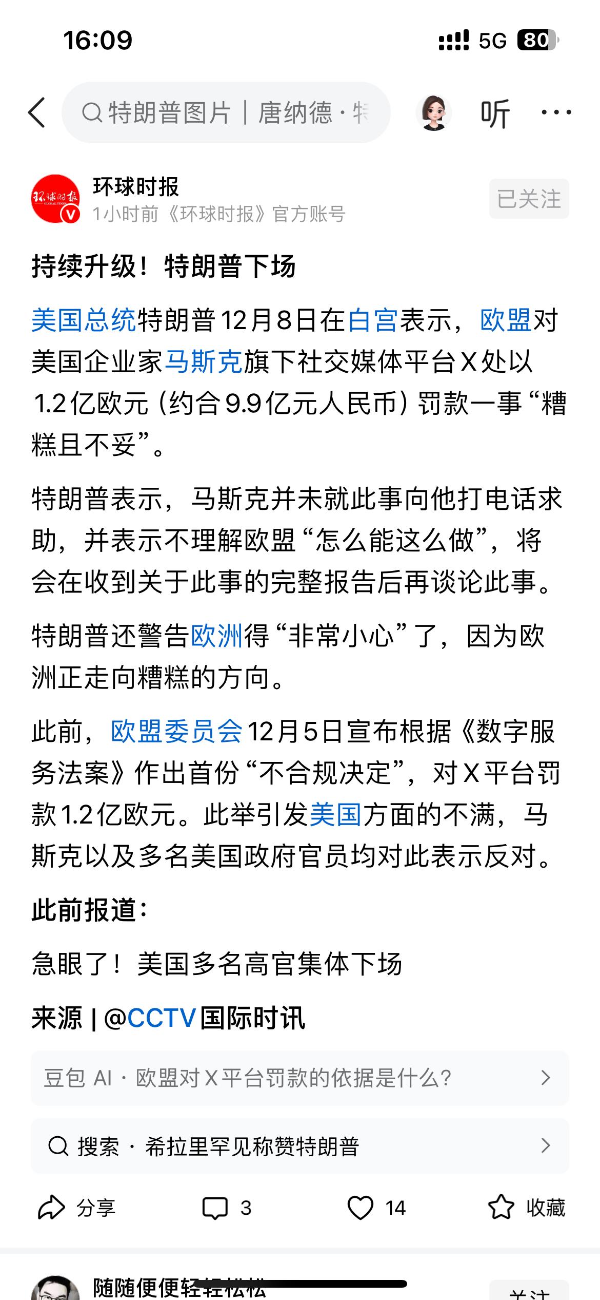 马斯克挨欧盟1.2亿欧元的罚款,特朗普发声支援。 虽然马斯克没有向特朗普求助此事,但是特朗普此时也要主动发声,毕竟这是他缓和和马斯克关系的好时机。 特朗普警告欧盟,“得非常小心”因为欧洲正在走向非常糟糕的方向! 这也正应了一句话,“打狗也要看主人”,毕竟马斯克旗下的X社交平台作为美国的企业,美国罚款可以,欧盟罚款不可以。