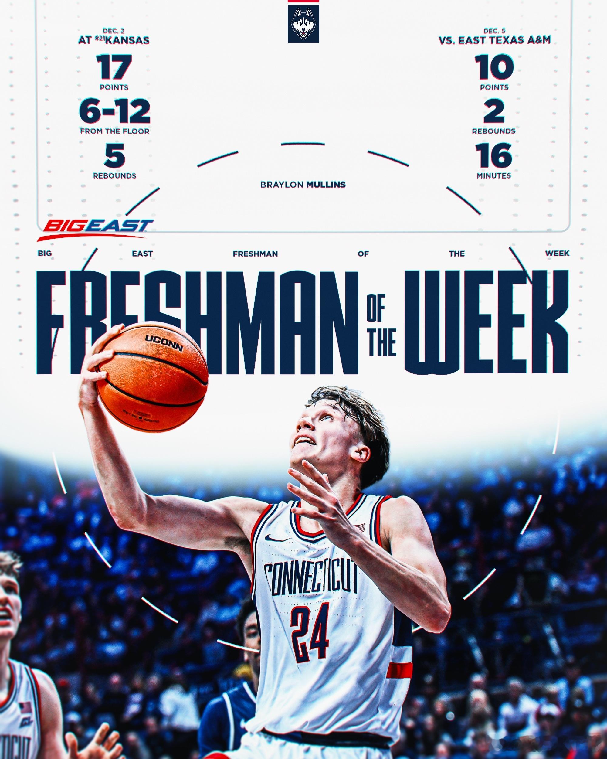 Big East联盟第5周表现奖(2025-2026赛季)。 最佳球员:Tre Carroll,最佳新生:Braylon Mullins。 最佳球员:Chef McCurry,最佳新生:Ava Zediker。