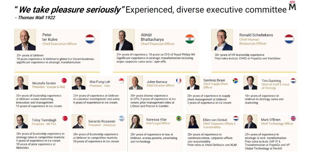 早年曾负责中国冰淇淋业务的PeterterKulve为公司首席执行官。荷兰皇家飞利浦公司前CFOAbhijitBhattacharya为公司首席财务官。在中国及亚洲区,总经理仍是从联合利华冰淇淋过来的罗慧芬。