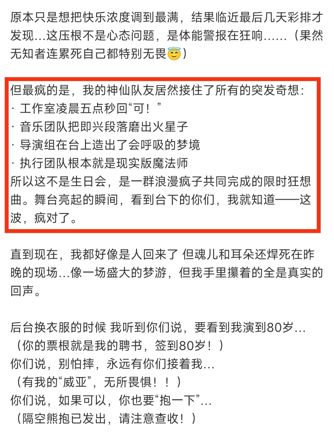彭小苒 浪漫疯子 再一次感受到了彭小苒的浪漫,在生日会的结束后的长文里还能感受到她的真诚和纯粹!不售票、自费准备伴手礼、联唱8首歌,但在字里行间写满的都是“谢谢你们能来看我”。她的浪漫,藏在细节里,会把和粉丝的相遇当作珍贵的约定,是永远保持对生活、对表演的热爱与赤诚,这样的“浪漫疯子”彭小苒太让人心动了