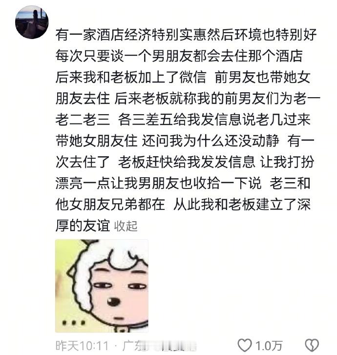 我原来的一个女同事,比较open,属于情史极混乱的,前前后后交了20几个男朋友。