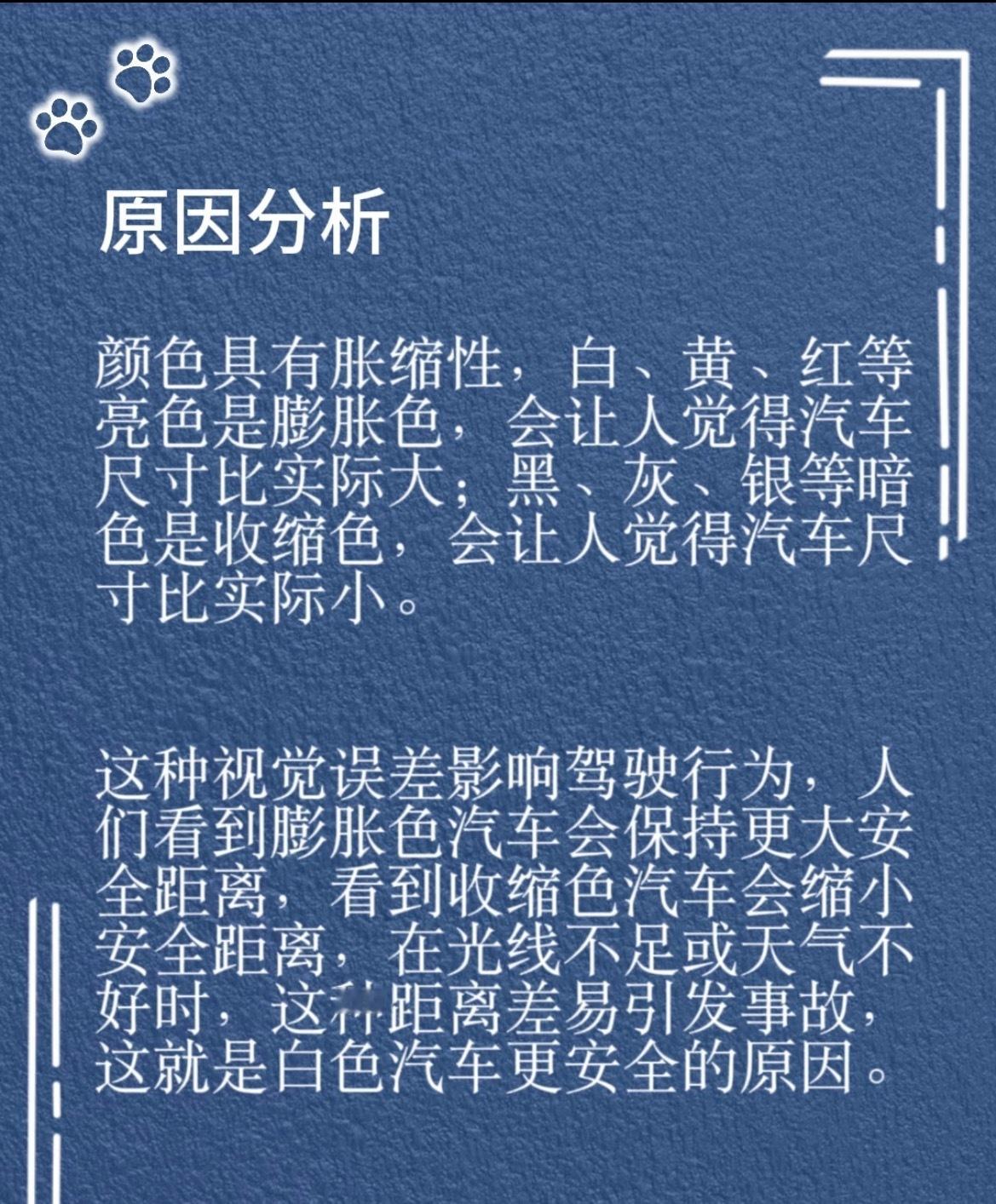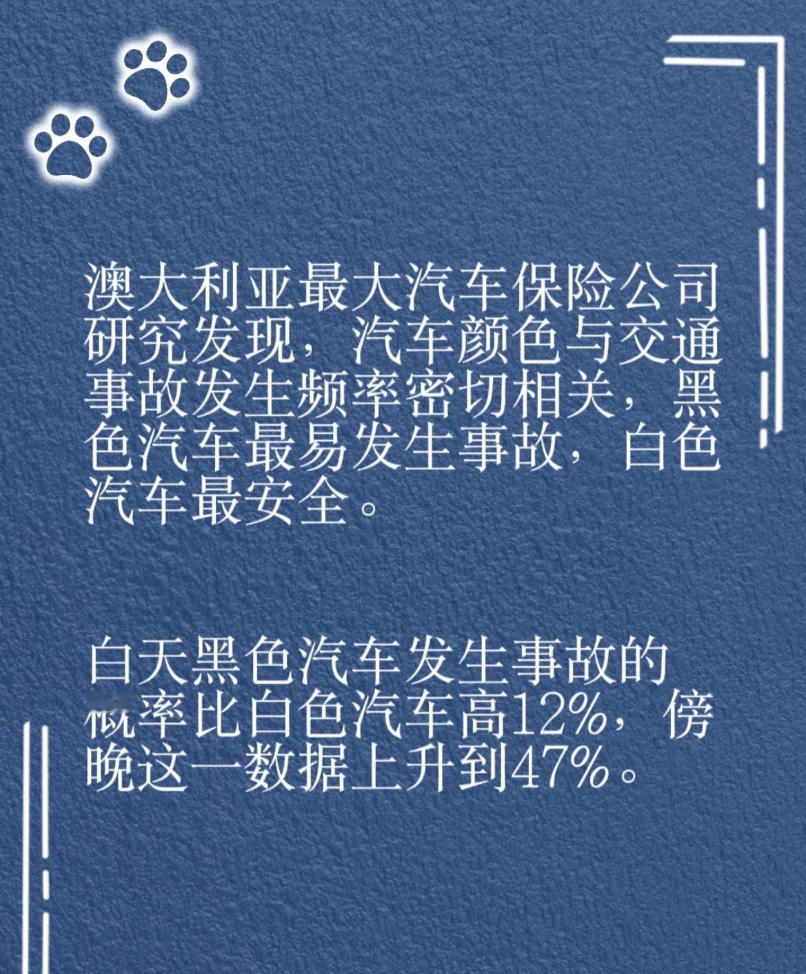 你是不是会奇怪,为什么现在大街上随便一辆车就是白色的?其实颜色不仅关乎颜值,更直接影响安全!数据证明,白色车事故率最低,黑色车最高,尤其是傍晚时分!🌃📊 颜色与事故率关系(基于澳洲保险数据):1️⃣白天:黑色车事故率比白色车高12%2️⃣傍晚/夜间:黑色车事故率比白色车高47%!3️⃣安全排序:白 > 银 > 红 > 蓝 > 黑🔍 科学原理:颜色具有“视觉胀缩性”:✅ 膨胀色(白、黄、红):看起来比实际更大,其他车辆会保持更远距离❌ 收缩色(黑、灰、深蓝):看起来比实际小,容易被误判距离,安全距离不足🌆 环境影响因素:1️⃣光线不足时,深色车辆与道路环境融合,难以辨识2️⃣雨雾天气中,白色、银色等浅色车辆可见度显著更高我与汽车的日常大v聊车