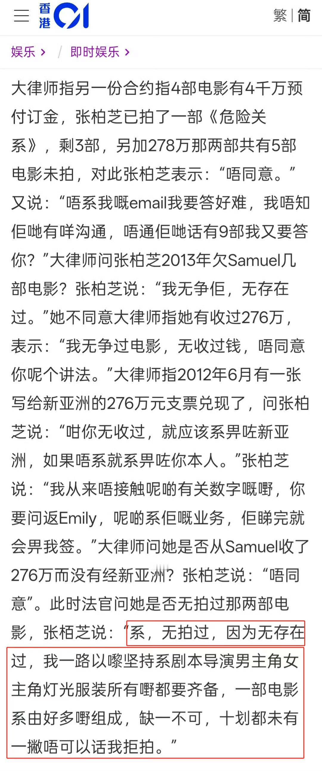 张柏芝否认收到前经纪公司电影剧本 面对千万索赔指控,张柏芝在法庭上逻辑清晰地否认收到电影剧本,也不承认收取过预付款,直指对方指控缺乏合理依据,静待案件结果。