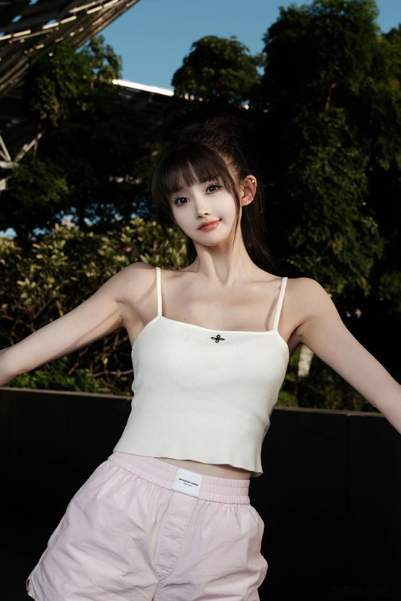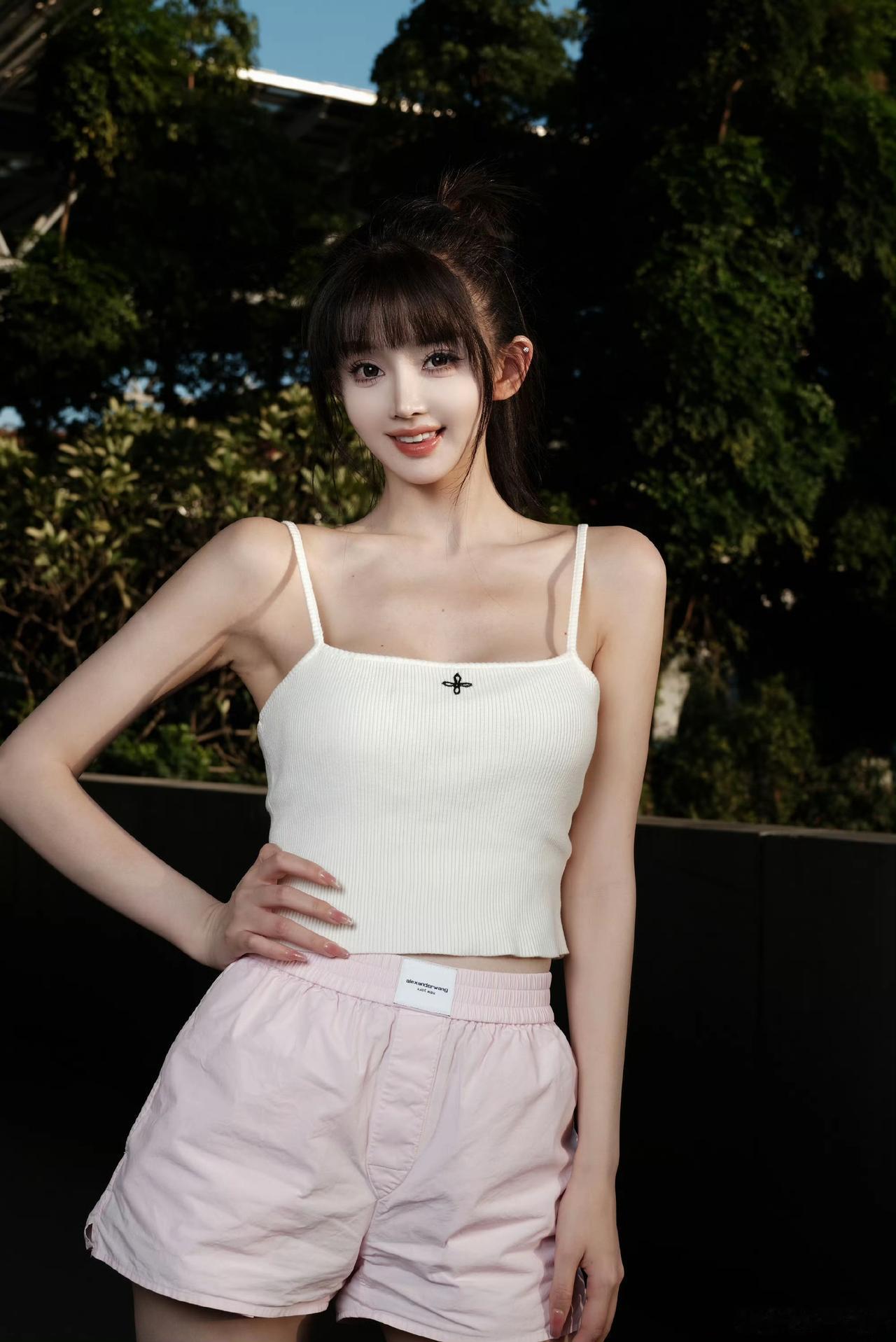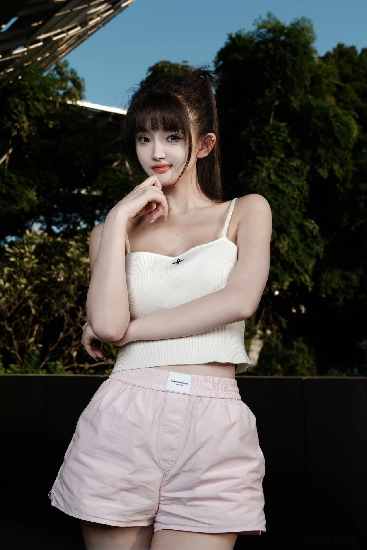夏日清新少女风,粉色短裤搭配白色背心,阳光下的甜美笑容🌞💕
