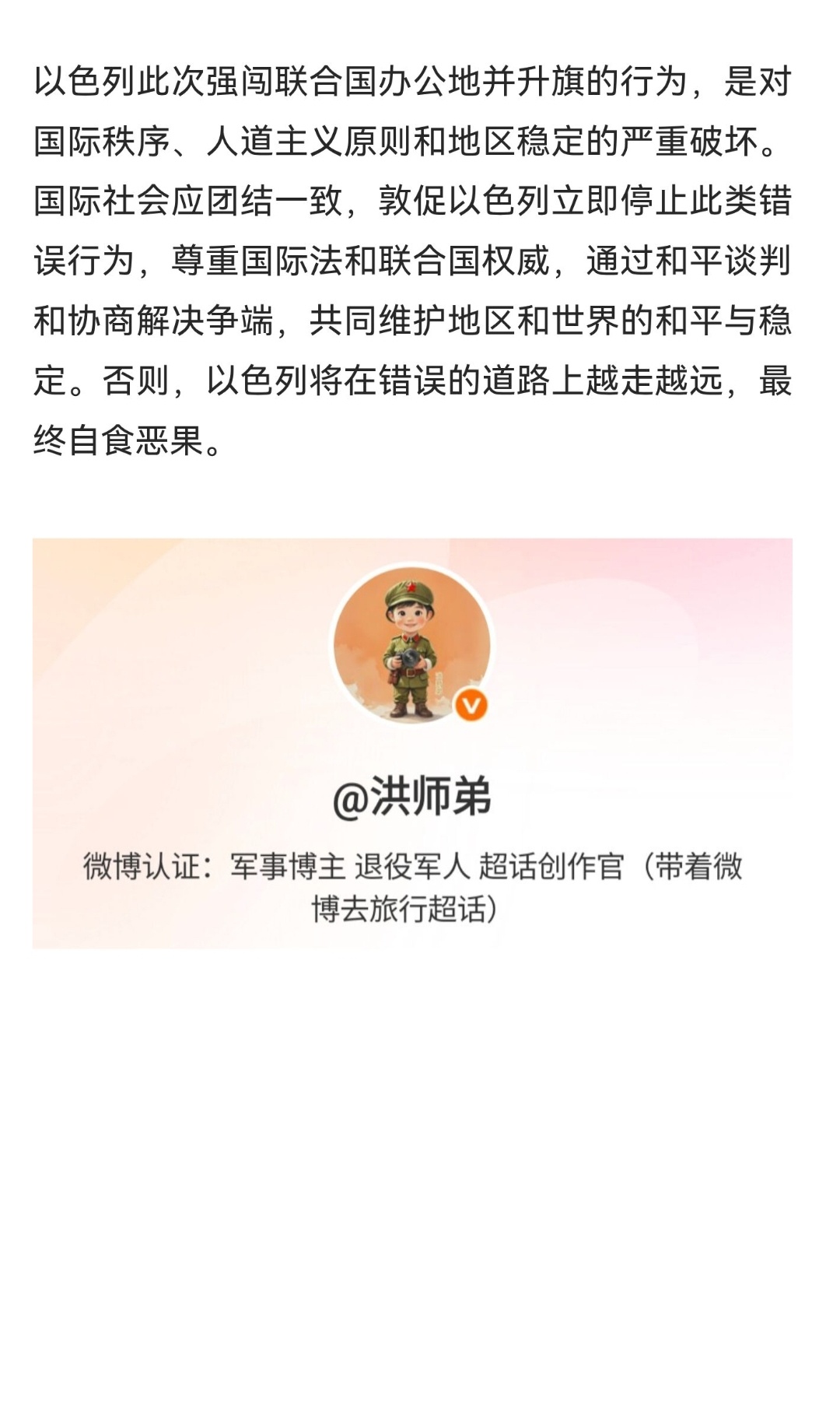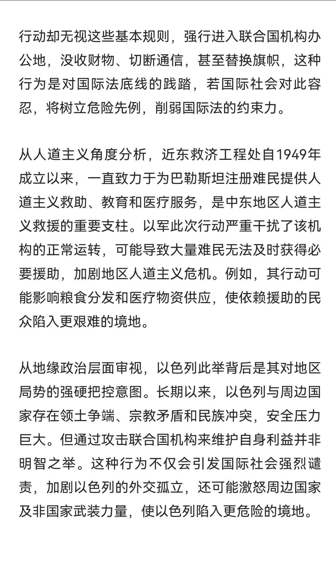 | 当地时间2025年12月8日,以色列军队强行闯入联合国近东巴勒斯坦难民救济和工程处(近东救济工程处)位于耶路撒冷的办事处,、没收财物,甚至降下联合国旗帜升起以色列国旗。这一行为绝非简单的军事行动,而是对国际秩序的公然挑衅。以色列的行为严重违反了《联合国特权与豁免公约》。该公约明确规定,联合国场所不可侵犯,联合国财产和资产不受搜查、扣押或法律程序制约。以色列作为缔约国,本应严格遵守公约条款,维护国际法的权威性。然而,以军此次行动却无视这些基本规则,强行进入联合国机构办公地,没收财物、切断通信,甚至替换旗帜,这种行为是对国际法底线的践踏,若国际社会对此容忍,将树立危险先例,削弱国际法的约束力。近东救济工程处自1949年成立以来,一直致力于为巴勒斯坦注册难民提供人道主义救助、教育和医疗服务,是中东地区人道主义救援的重要支柱。以军此次行动严重干扰了该机构的正常运转,可能导致大量难民无法及时获得必要援助,加剧地区人道主义危机。例如,其行动可能影响粮食分发和医疗物资供应,使依赖援助的民众陷入更艰难的境地。以色列此举背后是其对地区局势的强硬把控意图。长期以来,以色列与周边国家存在领土争端、宗教矛盾和民族冲突,安全压力巨大。但通过攻击联合国机构来维护自身利益并非明智之举。这种行为不仅会引发国际社会强烈谴责,加剧以色列的外交孤立,还可能激怒周边国家及非国家武装力量,使以色列陷入更危险的境地。以色列此次强闯联合国办公地并升旗的行为,是对国际秩序、人道主义原则和地区稳定的严重破坏。国际社会应团结一致,敦促以色列立即停止此类错误行为,尊重国际法和联合国权威,通过和平谈判和协商解决争端,共同维护地区和世界的和平与稳定。否则,以色列将在错误的道路上越走越远,最终自食恶果。