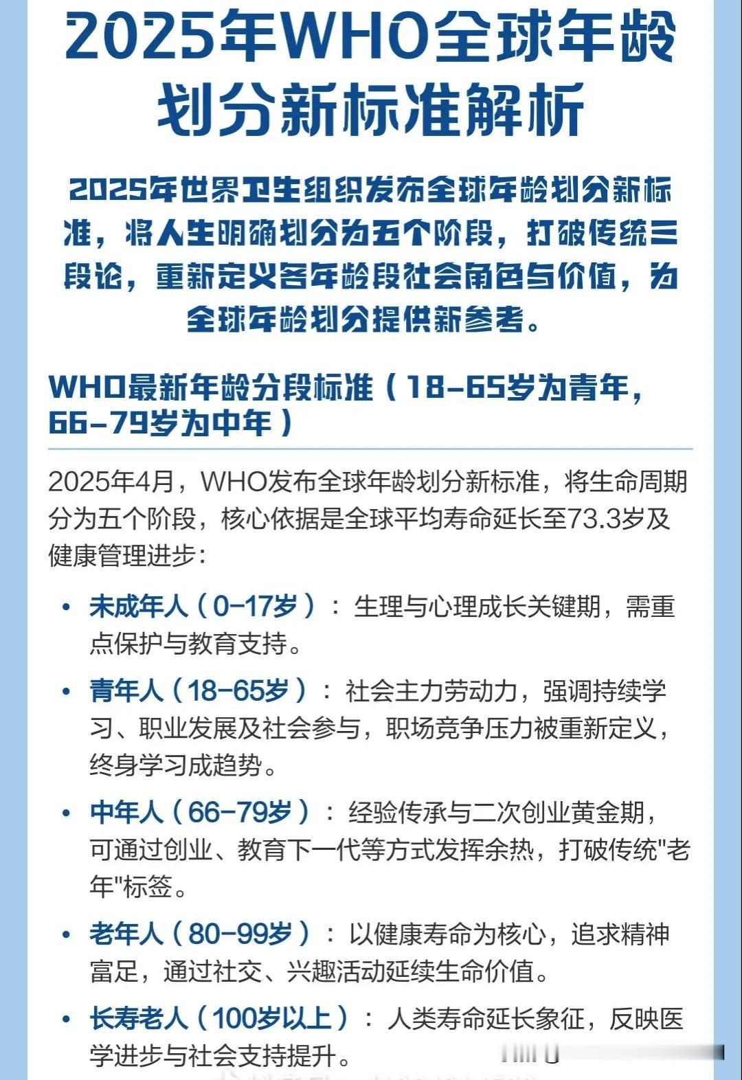 年龄划分,我有个疑问。 我国2025年初民政部、国家卫健委等七部门联合发布了最新年龄阶段划分标准,同时不同领域因需求不同还有专属口径,具体分类如下: 1. 通用最新四阶段划分:未成年人(0 - 17岁),衔接教育与法律保护相关政策;青年人(18 - 65岁),涵盖职场核心劳动力阶段;中年人(66 - 79岁),政策层面鼓励这一群体继续参与社会活动;老年人(80岁及以上),部分细分标准中还将其分为80 - 99岁普通老年群体和100岁及以上的长寿老年群体。 2. 特殊领域专属口径:人口统计上,国家统计局仍沿用0 - 14岁(少年儿童)、16 - 59岁(劳动年龄)、60岁及以上(老年人口)的分组用于就业、社保等统计 ;青年群体相关场景中,共青团及事业单位招聘等多以35岁作为青年年龄上限 ;退休政策方面,2025年未全面实施延迟退休,仍执行女性50/55岁、男性60岁的退休标准。 那么,这个疑问就是: 65周岁,景区还免门票吗? 因为已经不属于老年人了。 免费乘坐公共交通还能享受吗? 其实这也不是什么问题, 因为我们距老年人更远了一步。 还属于青年人嘛, 没有比年轻更重要。 同时也大大降低了老龄化率。