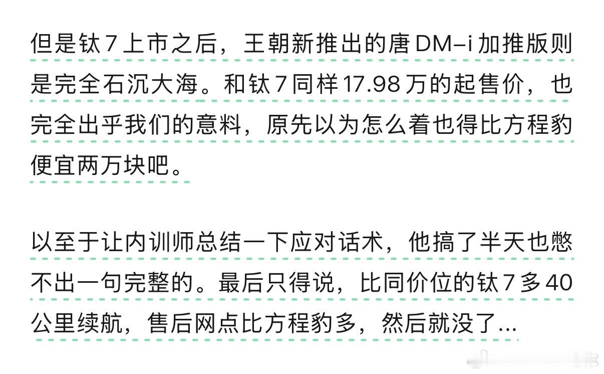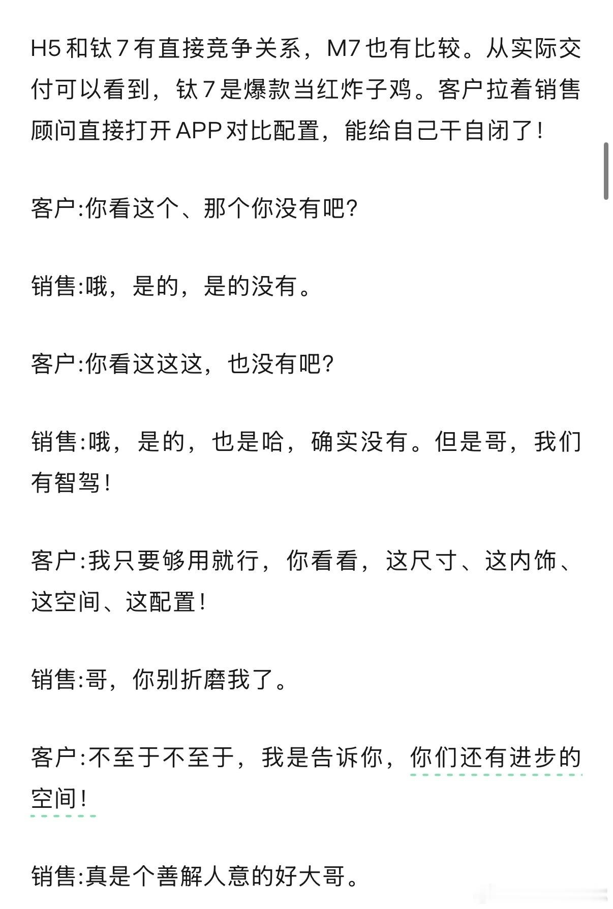 车fans这篇写钛7的文章太搞笑了比亚迪销售:搞半天憋不出一句完整话术,最后总结是销售网点比方程豹多吉利银河销售:不考虑座位数肯定被碾压,但也不用和钛7硬碰硬,因为自己热度都快没了鸿蒙智行销售:但是哥,我们有智驾!方程豹钛7汽车资讯新能源汽车