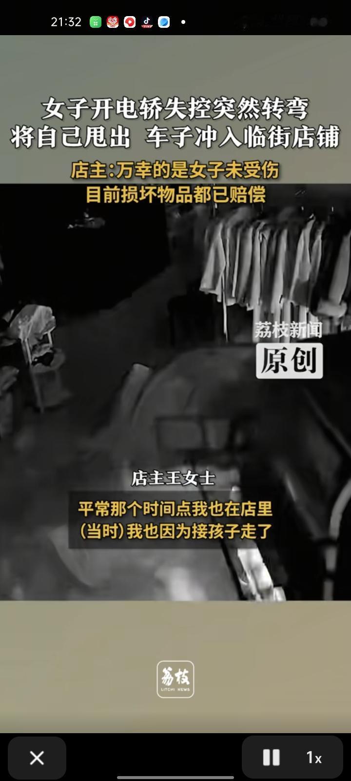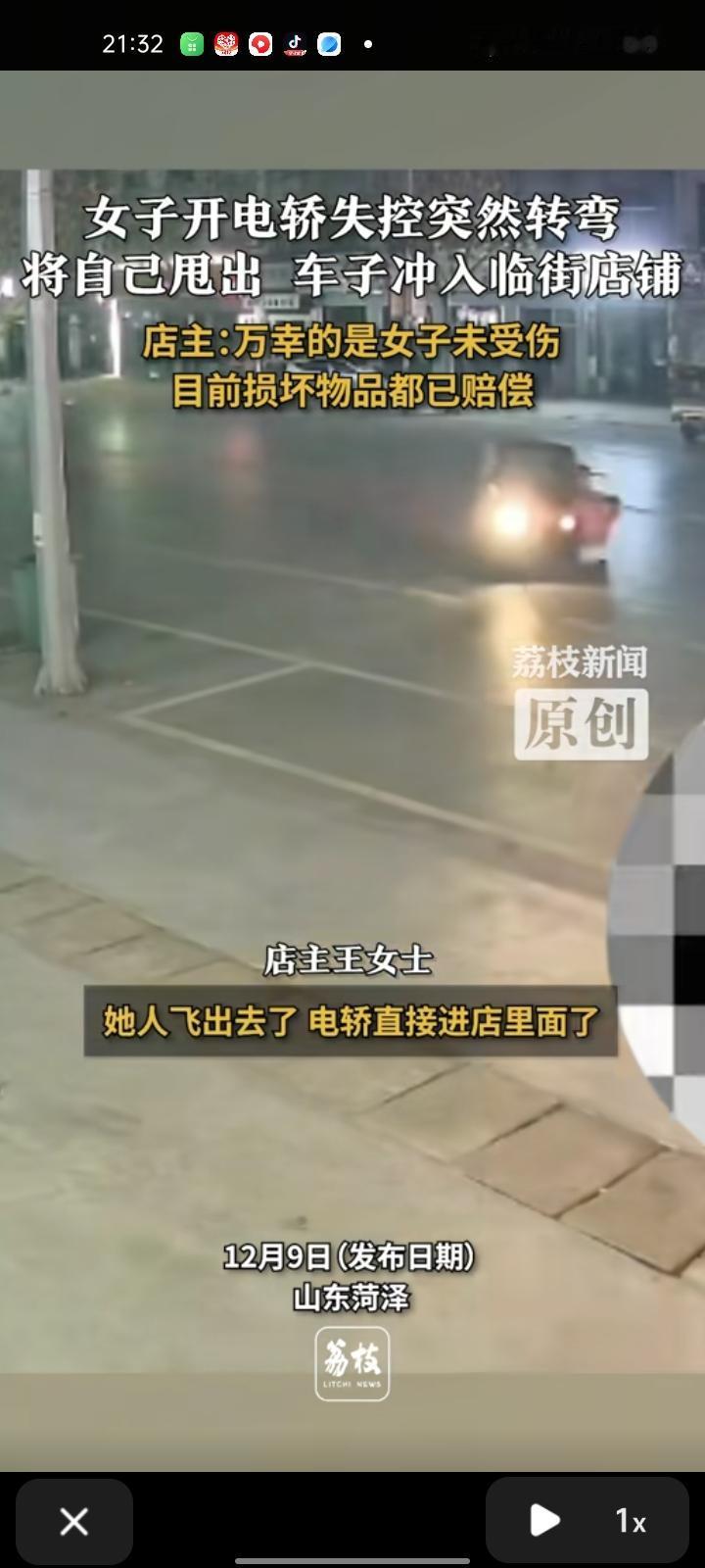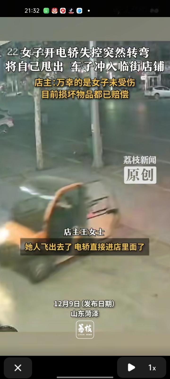 12月5日,菏泽市曹县。店主晒出监控视频,女子开电轿时失控突然转弯,将自己甩出,车子撞碎了店玻璃,万幸女子没受伤。事发时自己去接女儿走了,目前损坏物品给赔偿了,就是店内得24小时营业,因为玻璃门被撞坏了