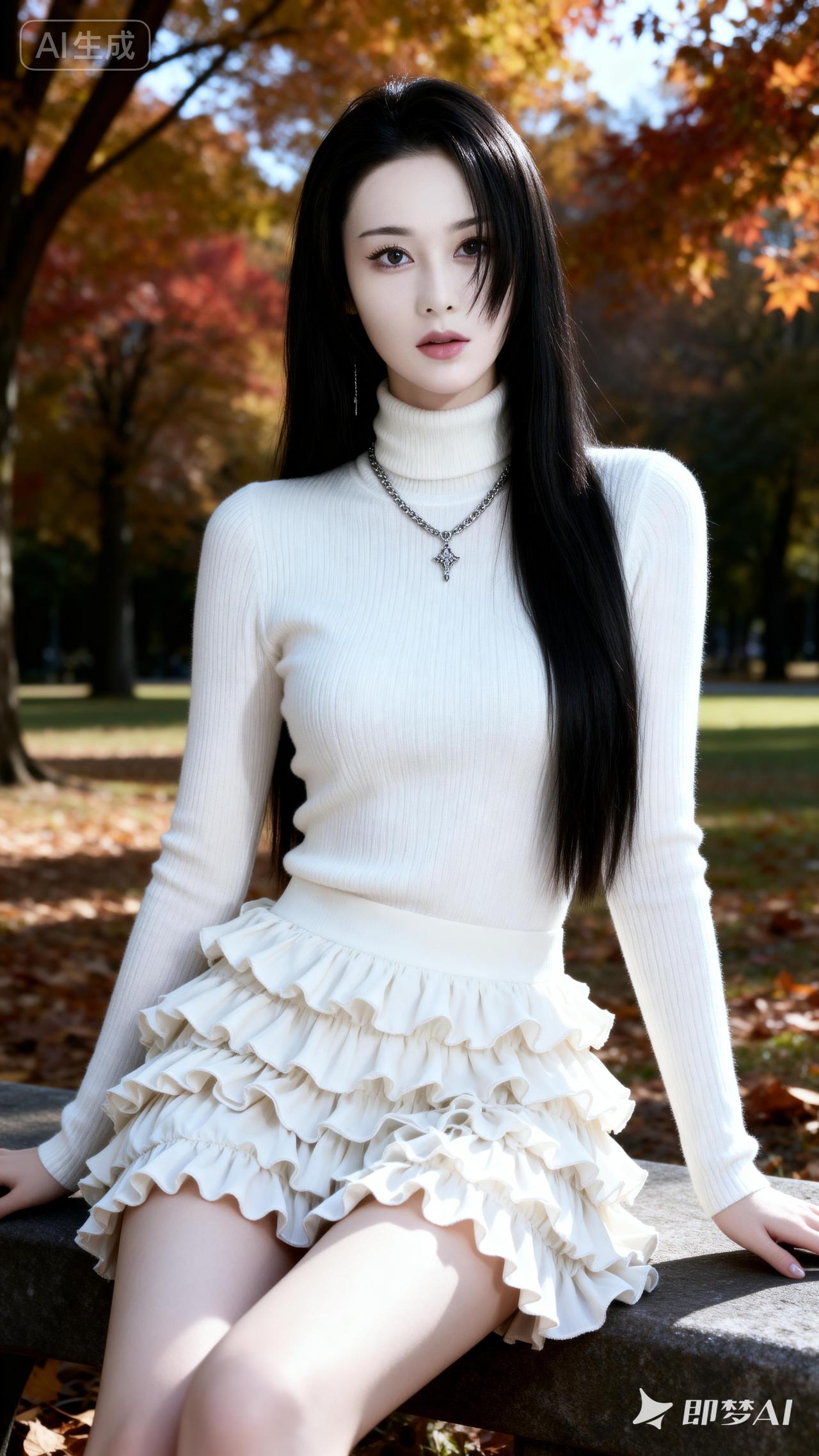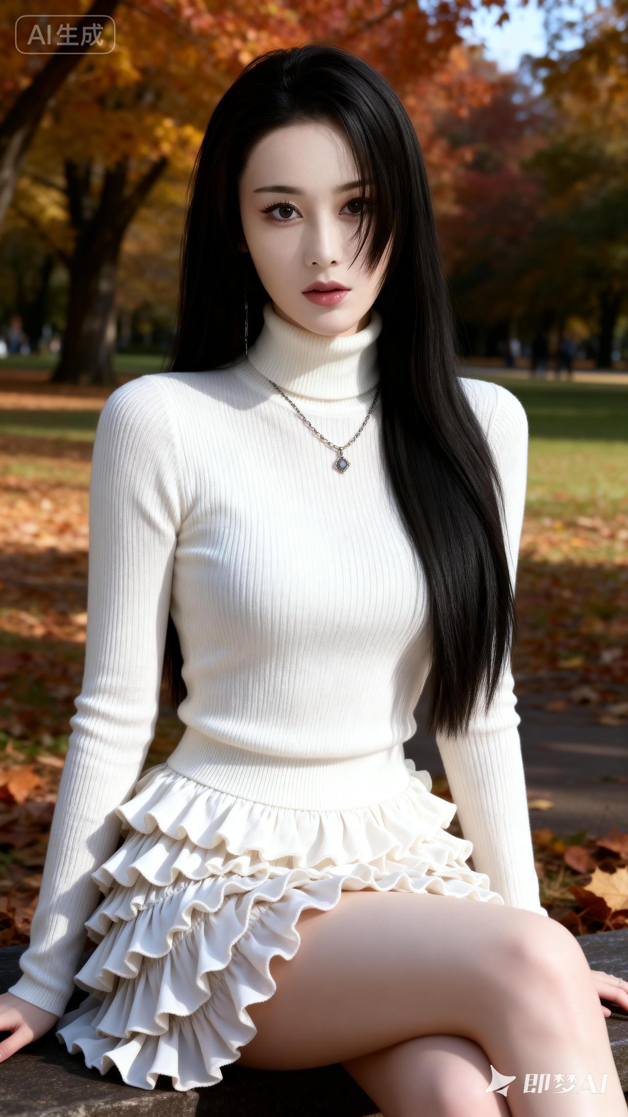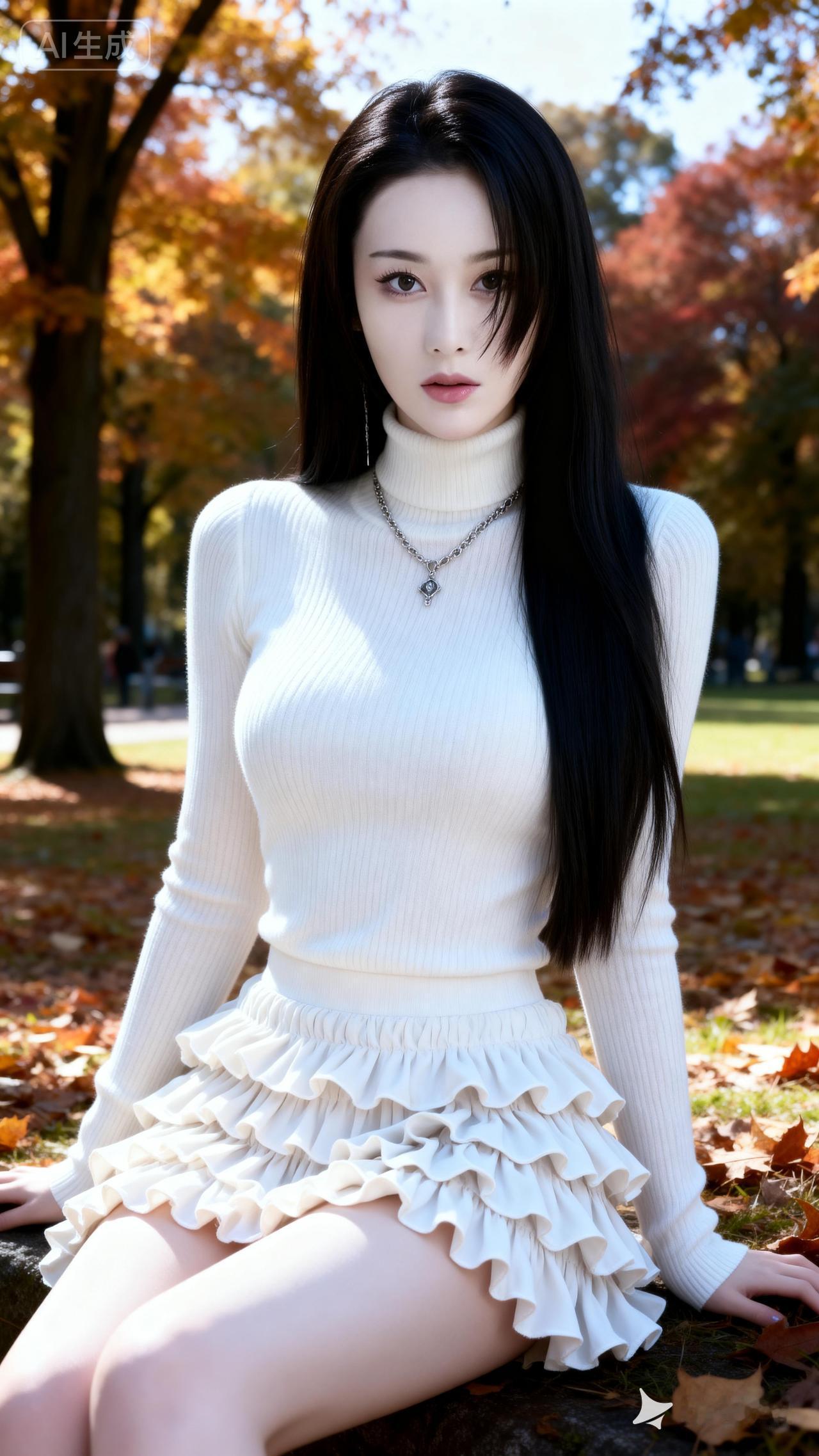 秋日暖阳下,白衣少女坐长椅,落叶纷飞,美如画。