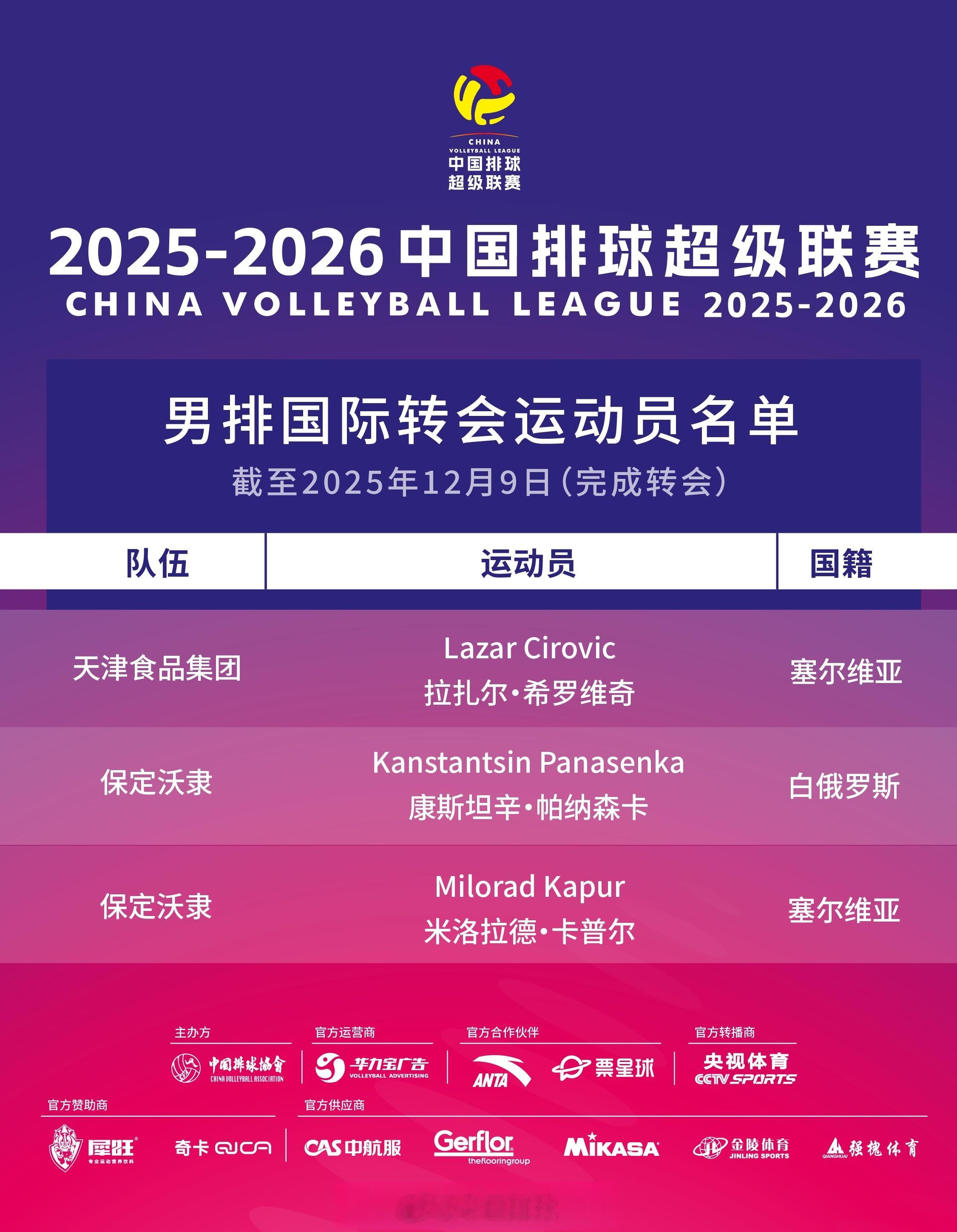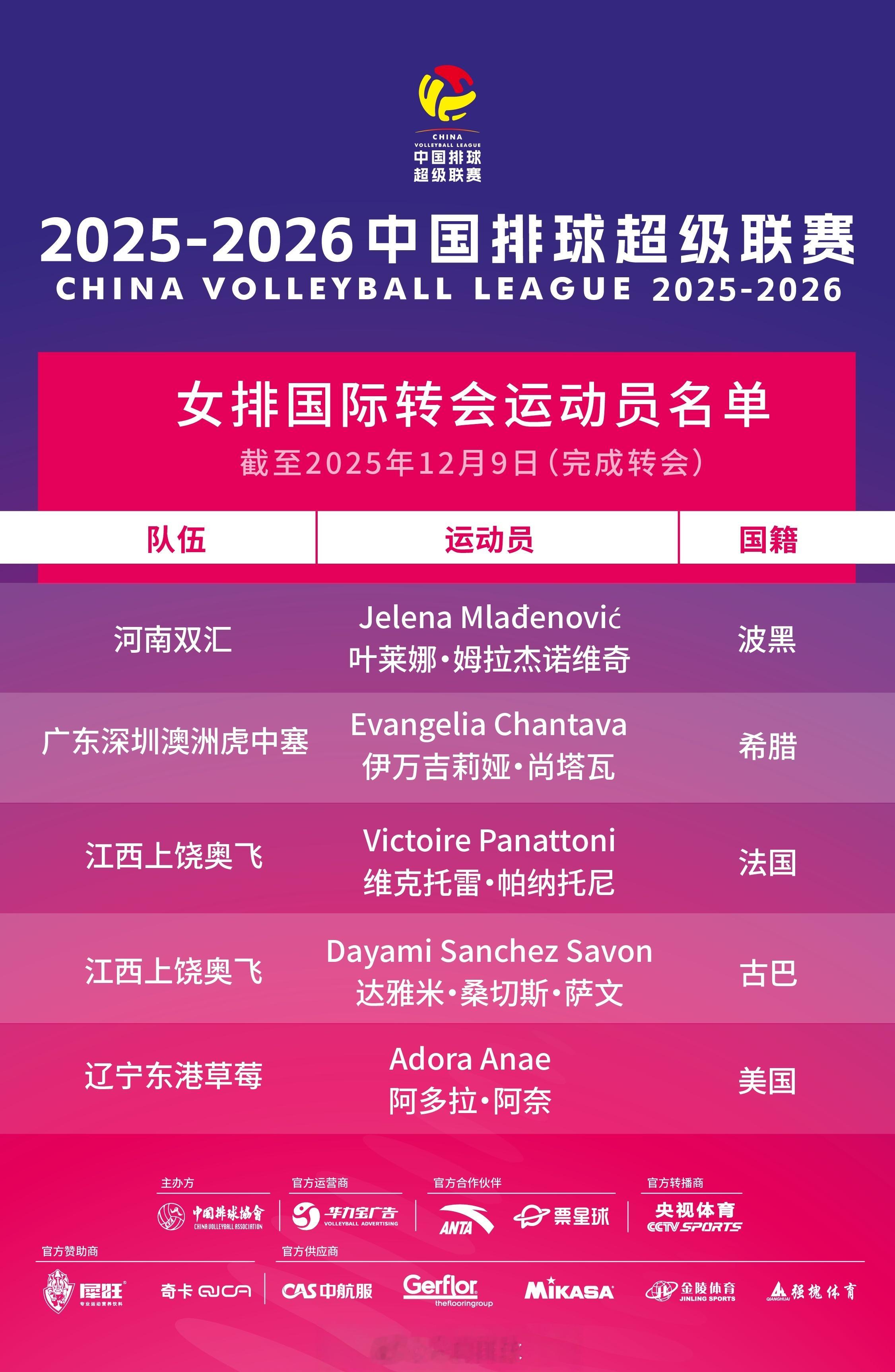 2025-2026中国排球超级联赛 国际转会运动员名单(截至2025年12月9日)。
