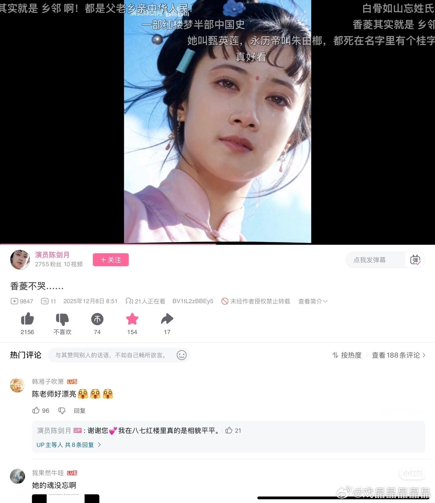 看来当年在红楼梦剧组里,红楼梦是本隐喻小说,这就是个公开的秘密。香菱饰演者陈剑月老师和薛蟠饰演者陈洪海老师都在网络上暗暗表态了。