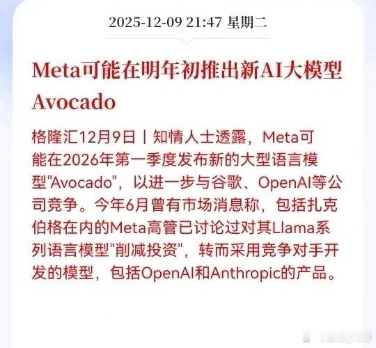 Meta这次是真的急了,直接把正在研究的重量级AI产品Avocado,拿出来跟OpenAI、谷歌正面较量。看样子,曾经的开源先锋也要变生意人了!简单来说,就是自家原来的Llama系列打不过别人,还传过要削减投资,甚至用别人家的模型。现在小扎想明白了,与其死磕旧路线,不如重组团队、砸钱挖人,换个思路重新开张!这个Avocado就是最新成果,而且很可能不再是大家随便用的共享软件,要变成Meta自己赚钱的独享产品!这招要是成了,AI大佬们的游戏规则可能要变。以后可能不是谁技术最开放谁赢,而是谁的产品最能打、最能赚钱谁说了算。Meta这步棋,押上的赌注可不算小啊!