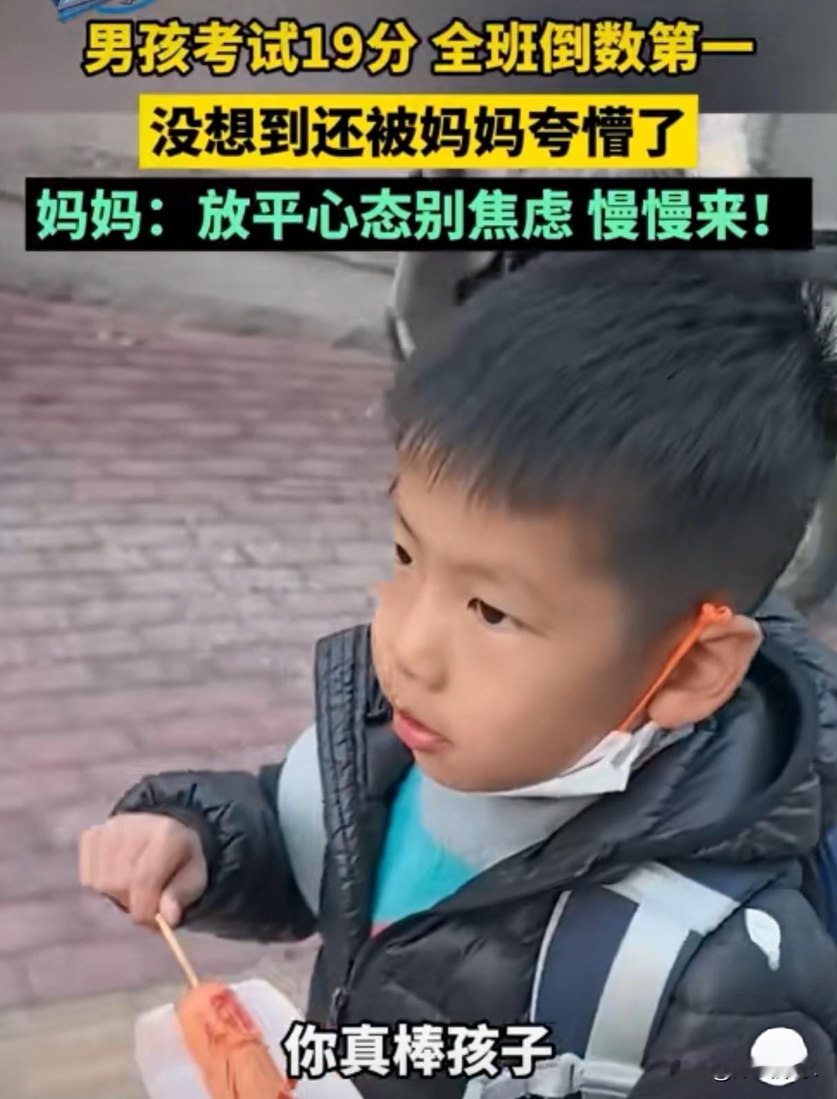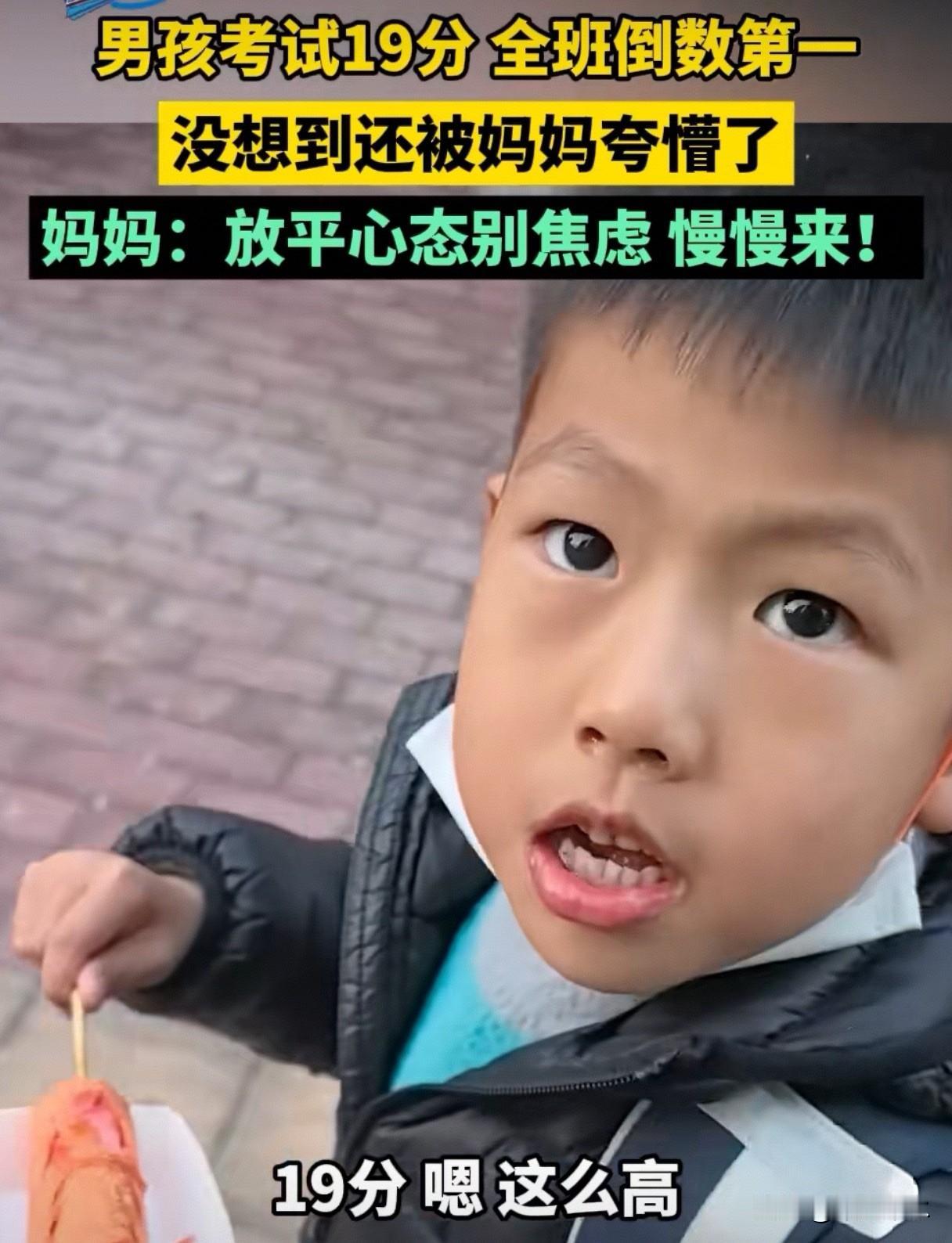 湖北一男孩被妈妈问考试分数时,不好意思说考了19分,妈妈竟笑答“这么高”。 男孩急补充“19分是最低的”,妈妈还夸“没事,你真棒孩子!”男孩直接懵了,半天说不出话。 孩子怕考差被骂,妈妈用反向鼓励减轻孩子压力,也是想让孩子别焦虑,放平心态慢慢来。 这样一来,孩子没有太多的心里负担,反而更愿意面对学习。 比起分数,爱与耐心更能养出向上的劲头——妈妈的“反向夸”,是孩子心底的光!