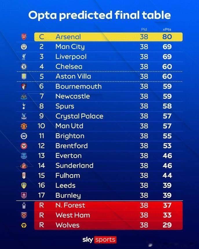Opta超级计算机预测2025/26赛季英超积分榜… 👇英超联赛
