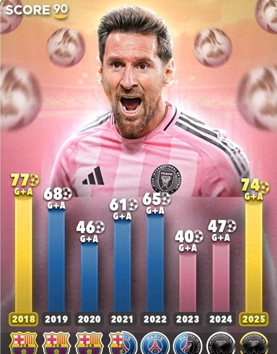梅西今年直接参与74球 2018年后最多随着迈阿密国际在总决赛中3-1击败温哥华白浪,夺得2025赛季美职联冠军,梅西也正式完成了自己全年最后一场比赛任务。这场胜利不仅为迈阿密国际带来队史又一重要荣誉,也为38岁的梅西个人高光的2025赛季画上圆满句号。数据显示,梅西在本年度共直接参与74粒进球,是他近7年来单年参与进球数的最高值,再次印证了其卓越的竞技状态与持续的影响力。从梅西最近8年的数据来看,他的表现虽随年龄自然波动,但整体仍保持着顶级水平。2018年,梅西高产参与77球,随后2019年参与68球,两年皆处于巅峰期。2020年受疫情影响赛程缩短,他的参与进球下降至46球。2021年来到巴黎后逐渐恢复状态,当年参与61球;到2022年,梅西在俱乐部与国家队多线发力,贡献65球,迎来个人生涯又一次高峰。2023年和2024年转战美职联后,梅西分别参与40球和47球。虽然数据略低于欧洲时期,但在竞赛节奏与球队风格完全不同的环境下,这一产量依旧不可忽视。而到了2025年,梅西迎来了登陆美国后的最佳赛季,他以参与74球的惊人表现,再度刷新个人近七年纪录,展现出巨星级的恐怖延续性。本赛季梅西不仅在进球和助攻层面表现突出,更重要的是他的存在极大提升了迈阿密国际的整体竞争力。从组织进攻到关键时刻的决断力,再到年轻球员的带动作用,梅西几乎影响了球队所有层面。迈阿密国际能够最终捧起冠军奖杯,与梅西的稳定发挥密不可分。