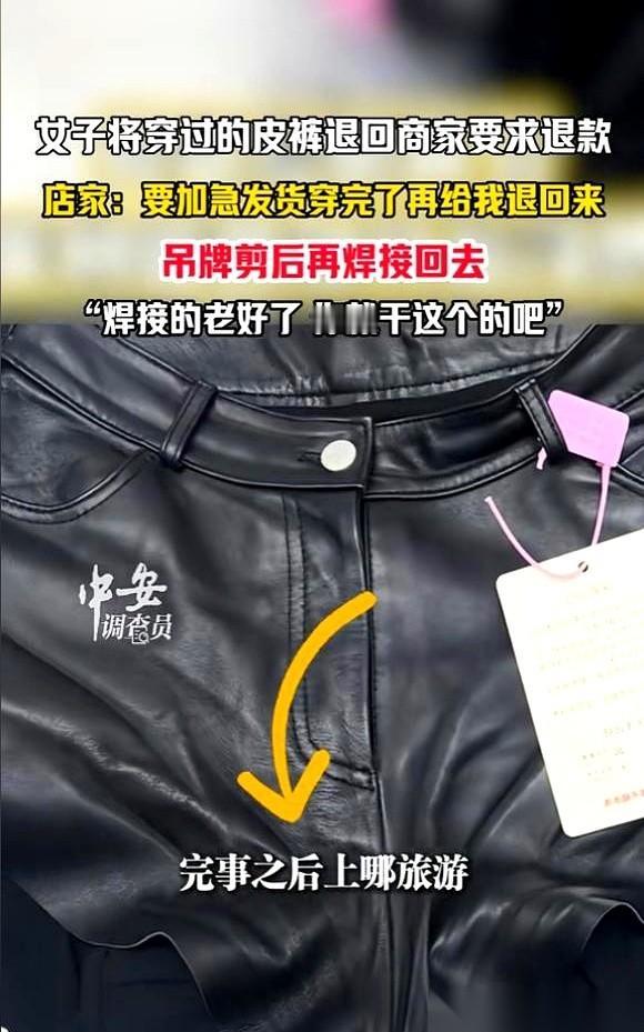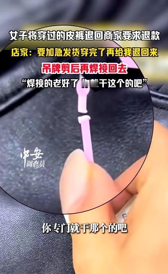 我真的会谢。 把吊牌剪了,再用火机给“焊”上??? 姐们儿,你这手艺,不去富士康流水线可惜了啊。 收到退货,打开包裹,一股子“人味儿”扑面而来。 皮裤上那几道褶子,比我脸上的法令纹都深,明显是穿出去浪了好几天。 行,这都算了,谁还没点儿急事呢。 但你把吊牌给我焊回去是几个意思? 你当我瞎吗?还是觉得我开店的是搞慈善的? 下单的时候“老板加急加急,明天就要!” 我还屁颠屁颠给你优先发货。 闹了半天,你是穿着我的裤子,去当你的临时“辣妹”,拍完照、蹦完迪,再完璧归赵? 东西我没法二次销售了,直接就是一堆垃圾。 钱你一分没花,还白得一件新衣服穿了好几天。 说真的,几十一百块钱,我亏得起。 但被这么明目张胆地当傻子耍,这口气我咽不下。 “七天无理由”是给体面人留的后路,不是给你这种人钻的空子。 这已经不是占便宜了,这是赤裸裸地偷。 偷走了我的货,也偷走了人和人之间那点儿最基本的信任。