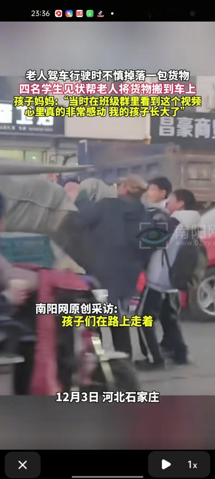 12月3日,石家庄市平山县。老人驾车行驶时不慎掉落一包货,四位学生见状帮老人把货物搬到车上,之后他们开心地离开了。孩子妈妈称,当时正好有人拍到并发到班级群里,在班级群里看到这个视频,心里真的非常感动,我的孩子长大了。
