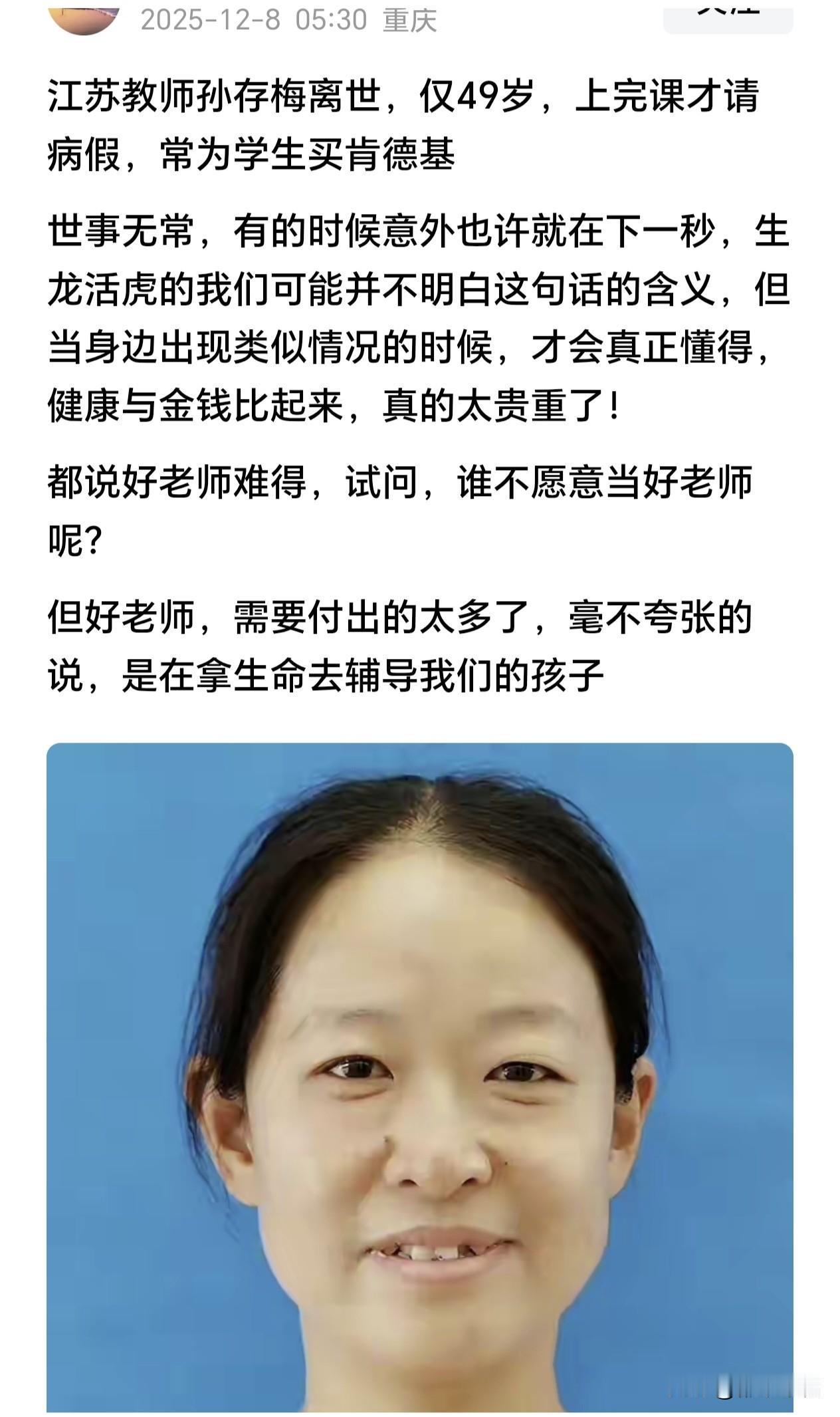 49岁的孙存梅老师走了,她是上完课后再请病假,请完病假就住进医院,第二天就去世了。不说她如何高尚,至少这种敬业精神让人感动。然而,没有了生命,拿什么来敬业呢?对于一名普通老师而言,这样矛盾的事似乎很平常。 多少人生孩子的前一天还在上课?多少人病了还坚守在岗位上?老师的岗位就是一个萝卜一个坑,你休息了要么你后续补上,要么其他人加班帮你代课。让别人代课,有些责任心强的老师还不放心。非得自己操心。 这些年老师待遇好了,编制吃香了,但是老师也越来越难做了。学生不好管,不敢管,一不小心学生不高兴走极端了,老师吃不了兜着走,要担责任。批评重了,学生或家长还可能投诉。在学生和家长面前,老师始终处于弱势地位。 可是老师又不能不管,不管孩子怎么样不爱读书,你还得想尽一切办法哄着他读,看着他写作业。城区的名校竞争激烈,老师自然不敢懈怠。就连我们这样的城郊学校,老师们也一个个拼得很。生源不好本来就是短板,再不想尽一切办法,成绩更难上去。老师没有成绩,评职称评优评先都靠边站。老师们不拼不行啊! 我们学校新来学校没有几年的,基本上都兼任班主任,整天忙忙碌碌跟着学生转,有晚自习的时候在学校,没有晚自习的时候也在学校看着孩子,或者利用一切空闲时间抓孩子补作业,完成没有完成的任务……体检下来,年纪轻轻,毛病一大堆。因为某些孩子给她们留下了阴影,她们还没有结婚就说不敢要孩子,怕自己的孩子万一跟某些人一样。 我看到这些年轻人,很多有名校研究生学历,但是跟家长打一个电话,说话是那样的谨小慎微。哪里还有一点师道尊严?他们为了孩子听话,何尝不是像孙存梅老师那样给孩子们买好吃的?一切为了孩子,为了孩子的一切。这话没有错,但是为了孩子,老师也应该爱惜自己,多多保重啊!老师也有家庭也有孩子啊!老师也是普普通通的人啊!