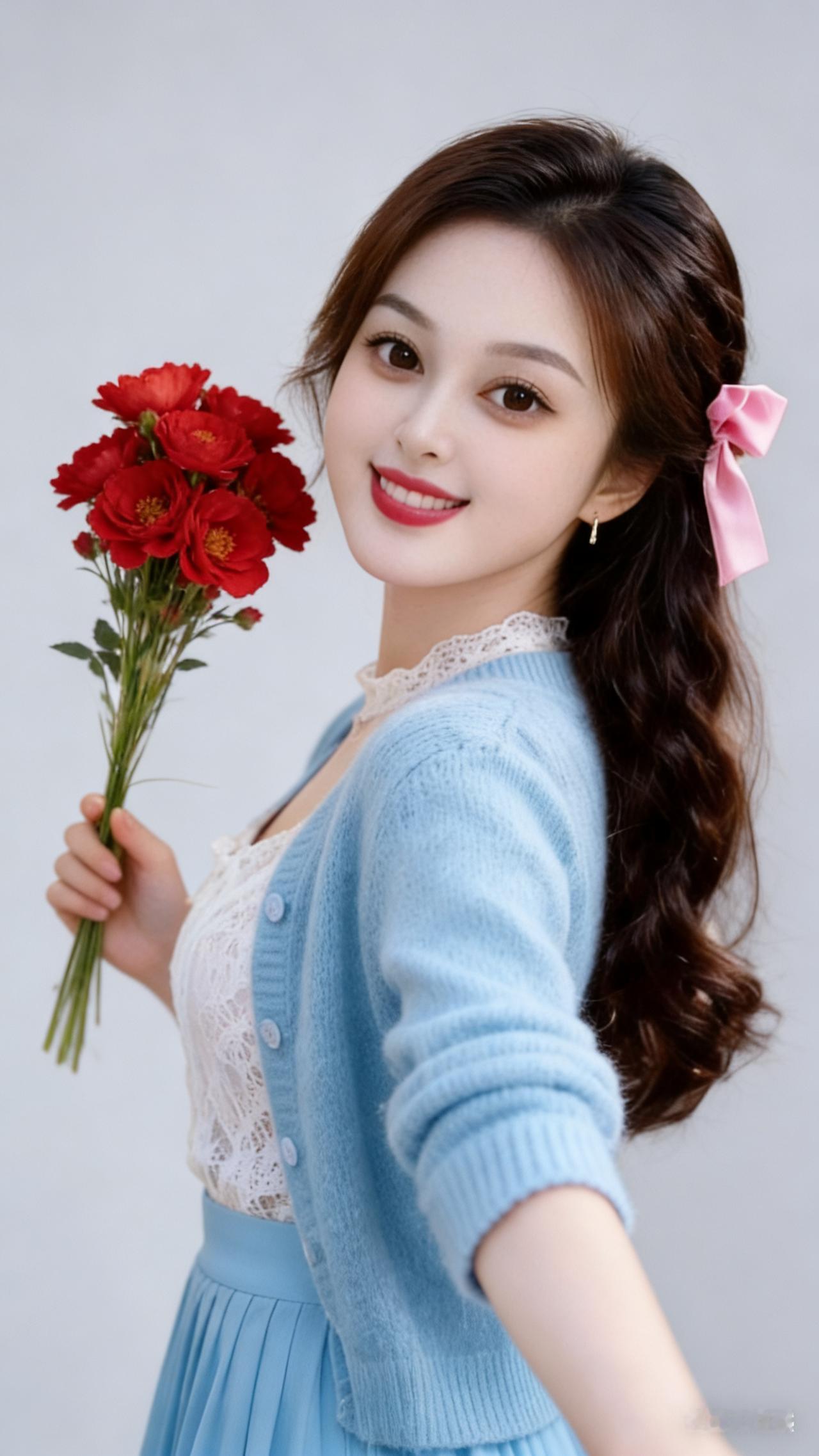 深棕微卷长发垂落,圆润脸清秀白皙,眉眼明亮、唇角微扬,尽显优雅温婉。