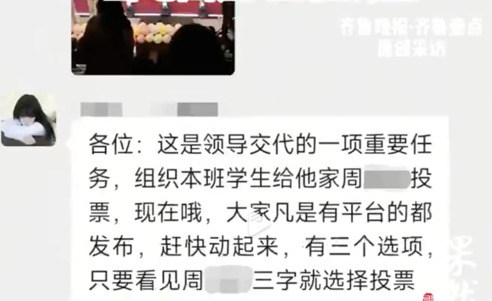 有学生发视频反映,其所在的班级群内有人下发通知,号召给一位就读于浙江某大学的学生进行“校园十佳歌手”投票,称“这是领导交代的一项重要任务,组织本班学生给他家周某某投票,凡是有平台的都发布”,群内的该发布人还表示,“只要看见周某某三个字就选择投票”。随后,博主又发布了一则班主任要求删除视频的内容。并附文“学校领导强制要求删视频。”