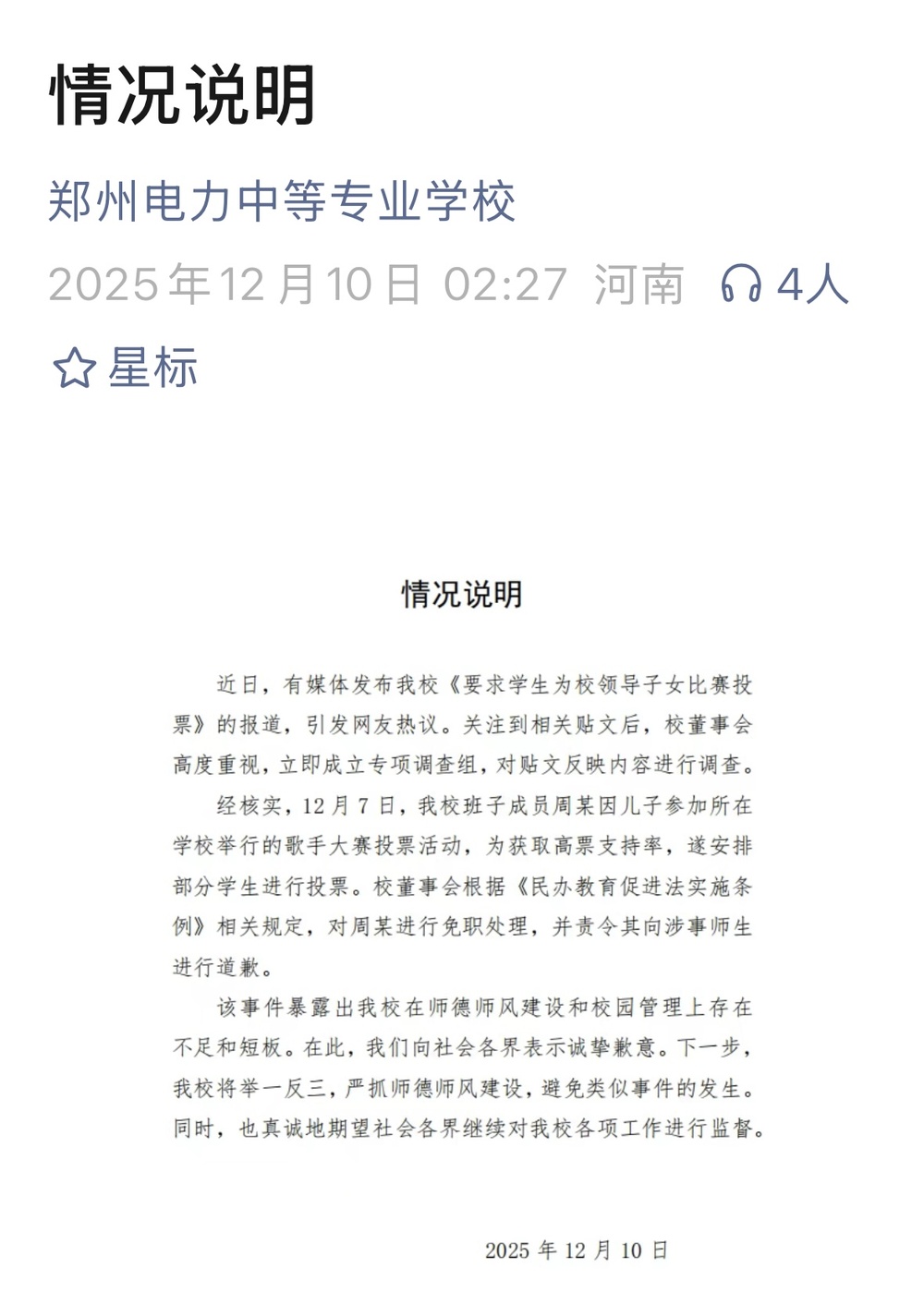 近日,郑州一职业学校要求学生为校领导子女比赛投票一事引发热议。郑州电力中等专业学校12月10日发布情况说明,称对涉事领导免职处理,并责令其向涉事师生进行道歉。