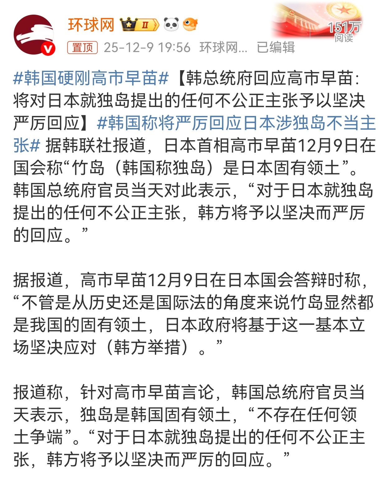 韩国硬刚高市早苗 满口胡言的高市早苗又被韩国给硬刚了!周边邻居都被它给得罪完了,还是当时教训的轻了!韩国方面主张,早在公元6世纪的新罗王朝时期(约公元512年),独岛就已经被纳入朝鲜半岛的管辖范围。而日本方面的最早记录,是追溯至17世纪初,一个渔民首次发现的独岛。