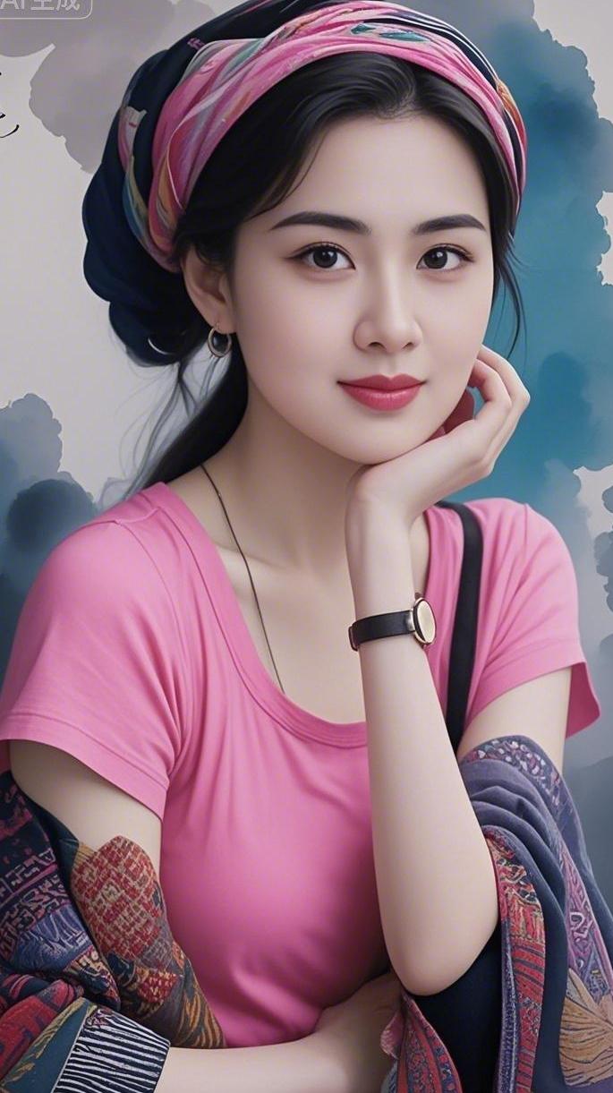 这位小姐姐穿着粉色T恤,搭配头巾,很有个性!