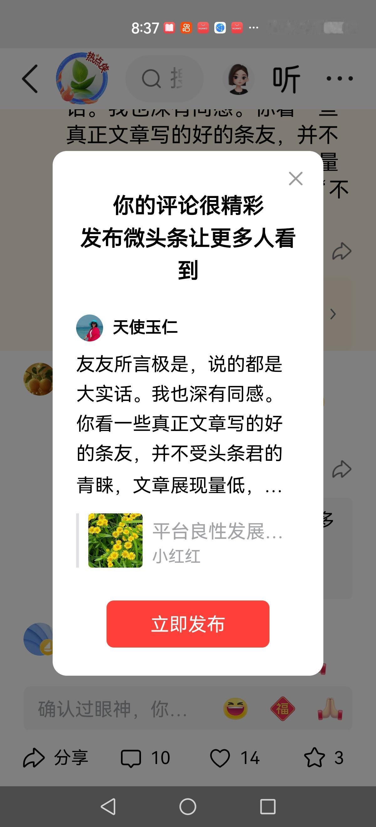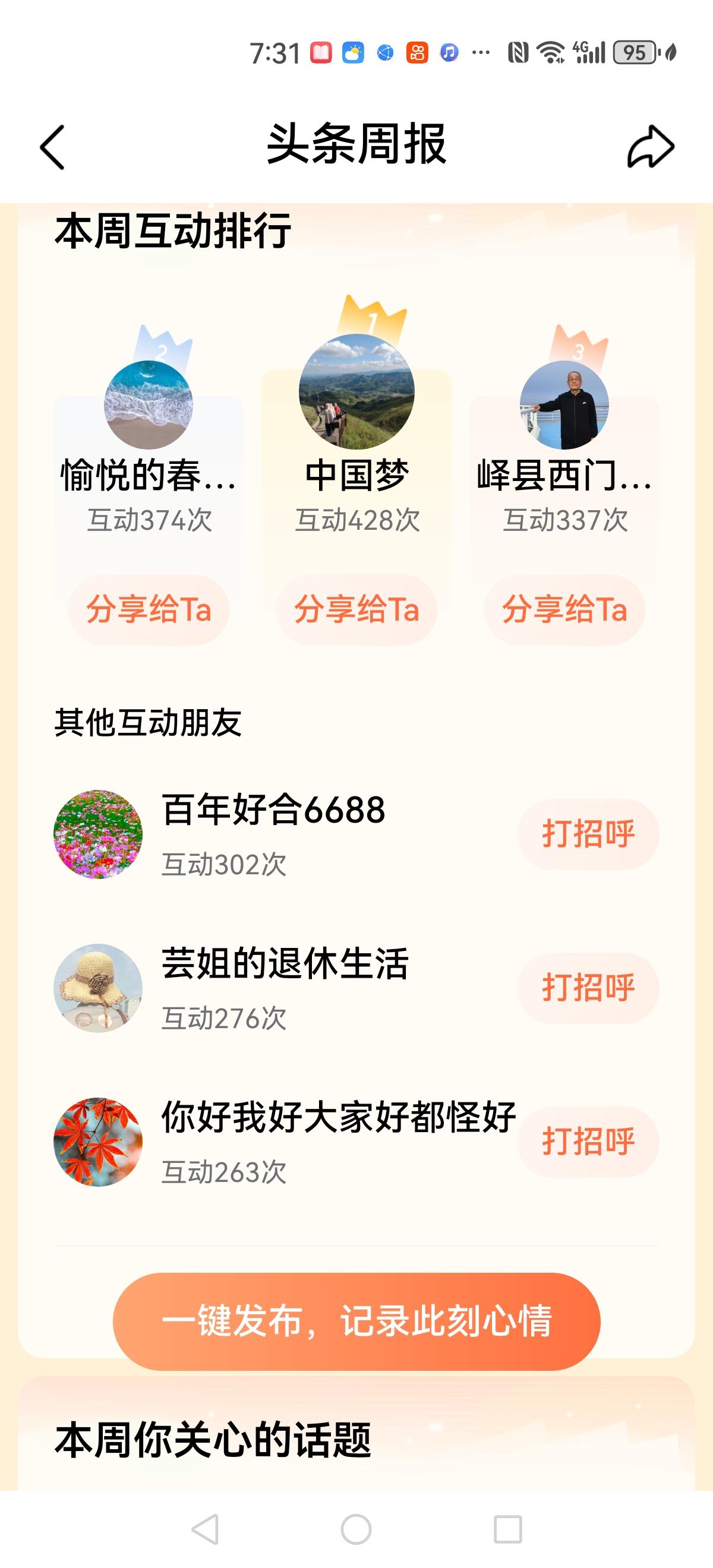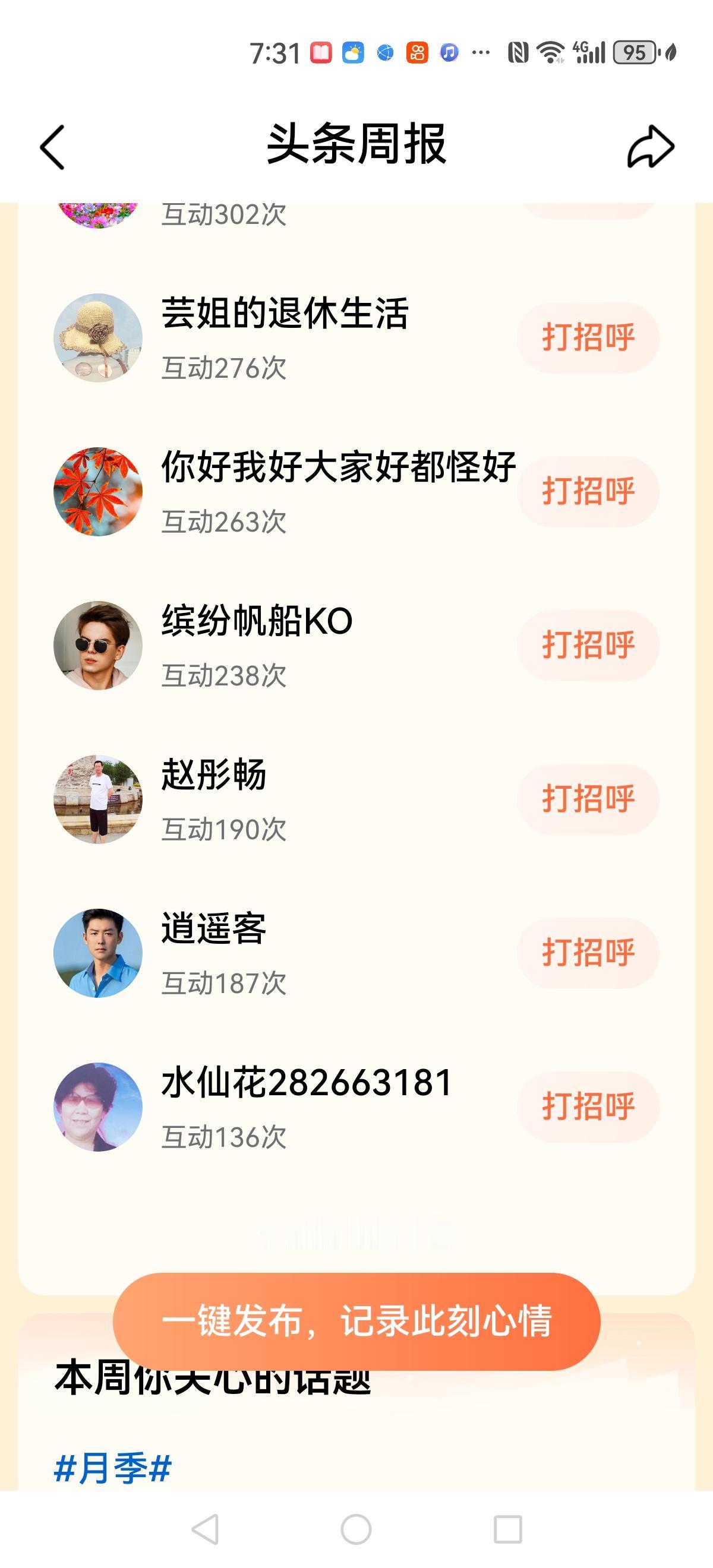 新的头条周报又出炉了。与我热情互动的前10名条友,恭喜祝福你们榜上有名。有了铁粉们的一路支持和陪伴,我的头条之旅更加有趣。 我喜欢头条!在这个大平台上,五湖四海的条友们,相聚在一起,互相学习,共同进步,让我们的生活多姿多彩。 这一周我与条友们,一如既往的认真阅读条友们的文章,并写出走心的“精彩点评”因为尊重了别人,也是尊重自己。