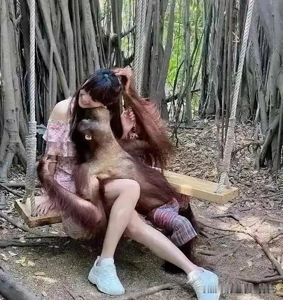 这照片乍一看着实让人摸不着头脑,左瞧右看、细细端详后,总算发现了其中的门道,原来是有猿猴千里迢迢来与她相会。猿猴的两个爪紧紧抱住她。如此亲密的接触,这女人胆子也太大了吧!就不怕被它侵犯吗?也不怕遭人笑话吗?