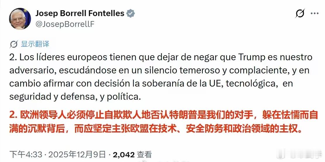 前欧盟委员会副主席博雷利发帖强烈抨击美国副总统万斯,说美国现在对待欧盟是“政治宣战”。