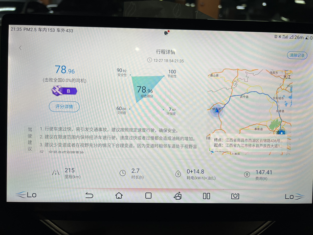 我这里还是关于油耗问题 整个路程216公里,高速大约160其余都国道快速路等等,全程国道快速路60-80速度,高速全程100定速,出发50电量,满油,本应216公里的油耗,跑走了332km,算一下多跑百分之50走,如果按照200公里走表300,400就是走600,600就是走900,目测差不多,之前120的速度,一箱油就是600左右,这个100的速度跑个700应该问题不大。算下来油耗大概9个左右