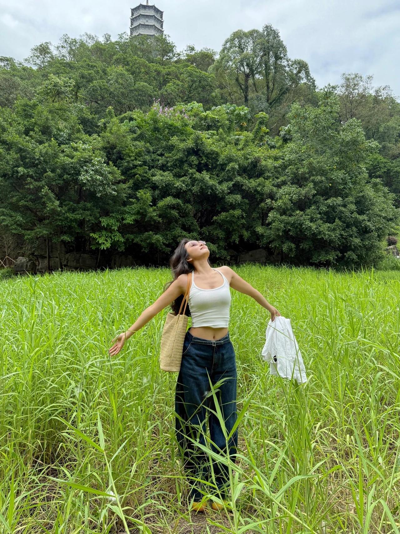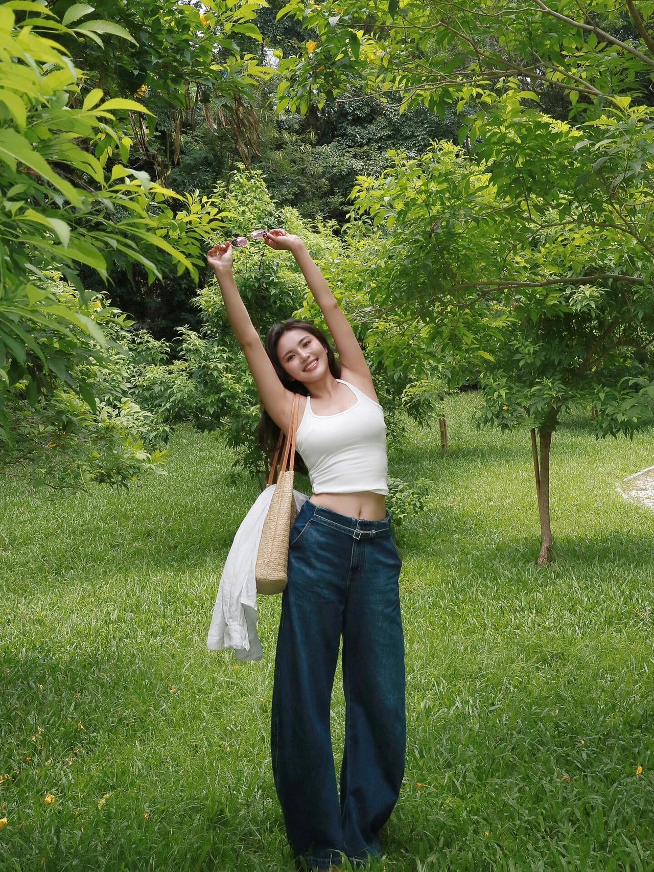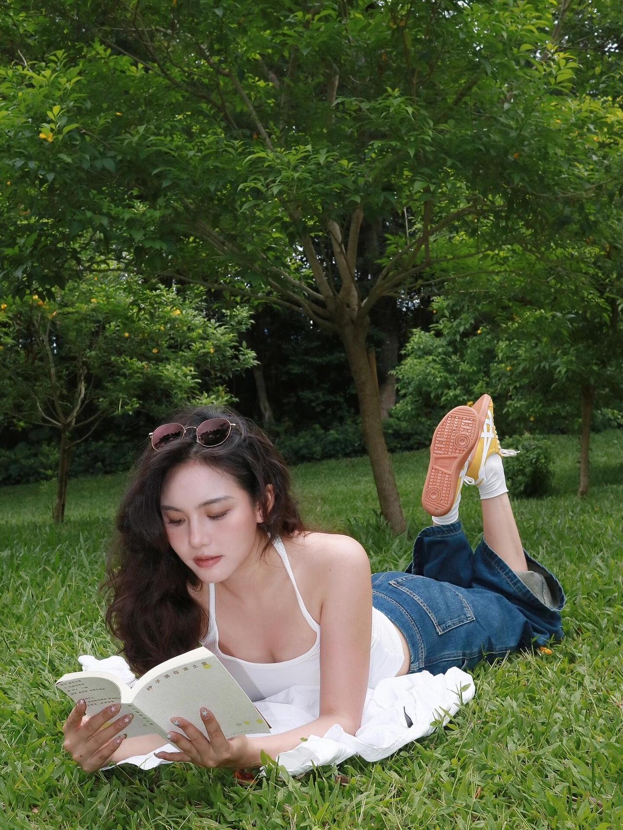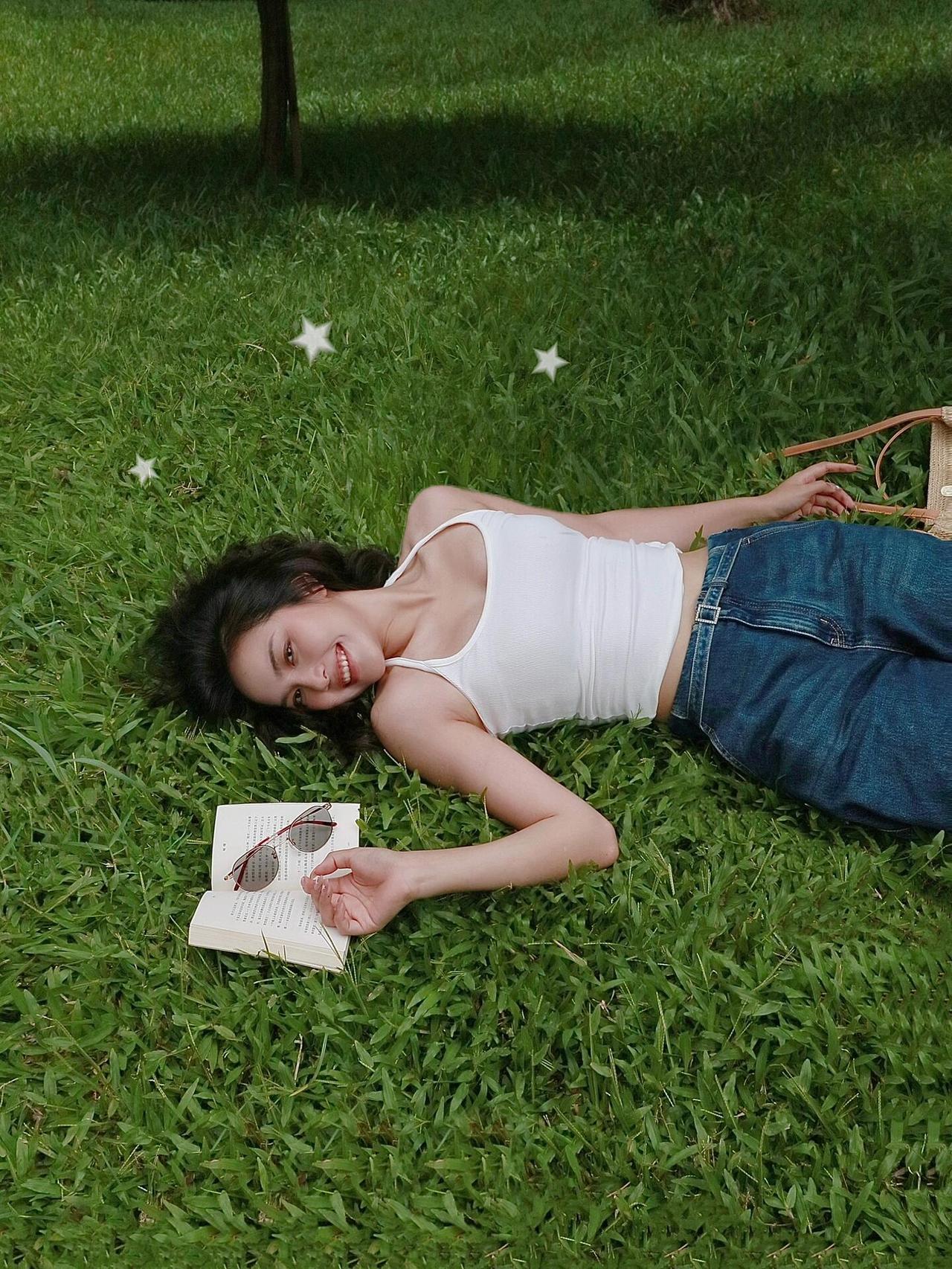 草木间的松弛 白背心裹着盛夏的风,落进草地的柔软里 她躺着,发丝漫过青草地 像漫过一捧不慌不忙的温柔 摊开的书页上,墨镜斜倚着 像倚着一段不肯被追赶的时光 趴在草地上翻书的刹那 帆布鞋的鞋底朝着天光 把细碎的欢喜,晾在枝叶筛下的光斑里 紫花漫过脚踝时,她仰头笑 风裹着草木的香,吻过她的脸颊 所有的紧绷,都被这抹鲜活揉碎 走在林荫道上,她张开双臂 白衫系在包上,像系住一寸轻盈 脚步踩过落满光斑的路 身后的树影晃了晃,晃成温柔的背景 高草没过膝头的瞬间 她仰头接住风,也接住整片山野的松弛 长椅上靠着的模样,是时光的慢 黄球鞋蹭着石阶,书页停在某一行 不必急着赶路,不必凑谁的热闹 只在草木间,做最舒展的自己 让风来,让光来,让欢喜落满衣襟 成了盛夏里,最熨帖的人间米色背心连衣裙 文艺松弛感穿搭 穿裙子的温柔 时光里的温润 田野里的松弛感 文艺松弛感 温柔系背心