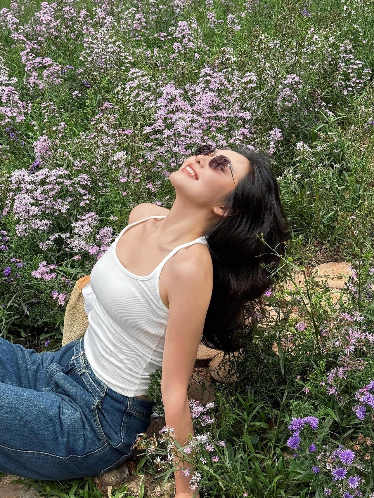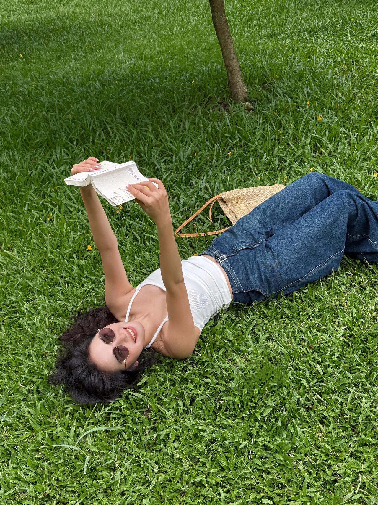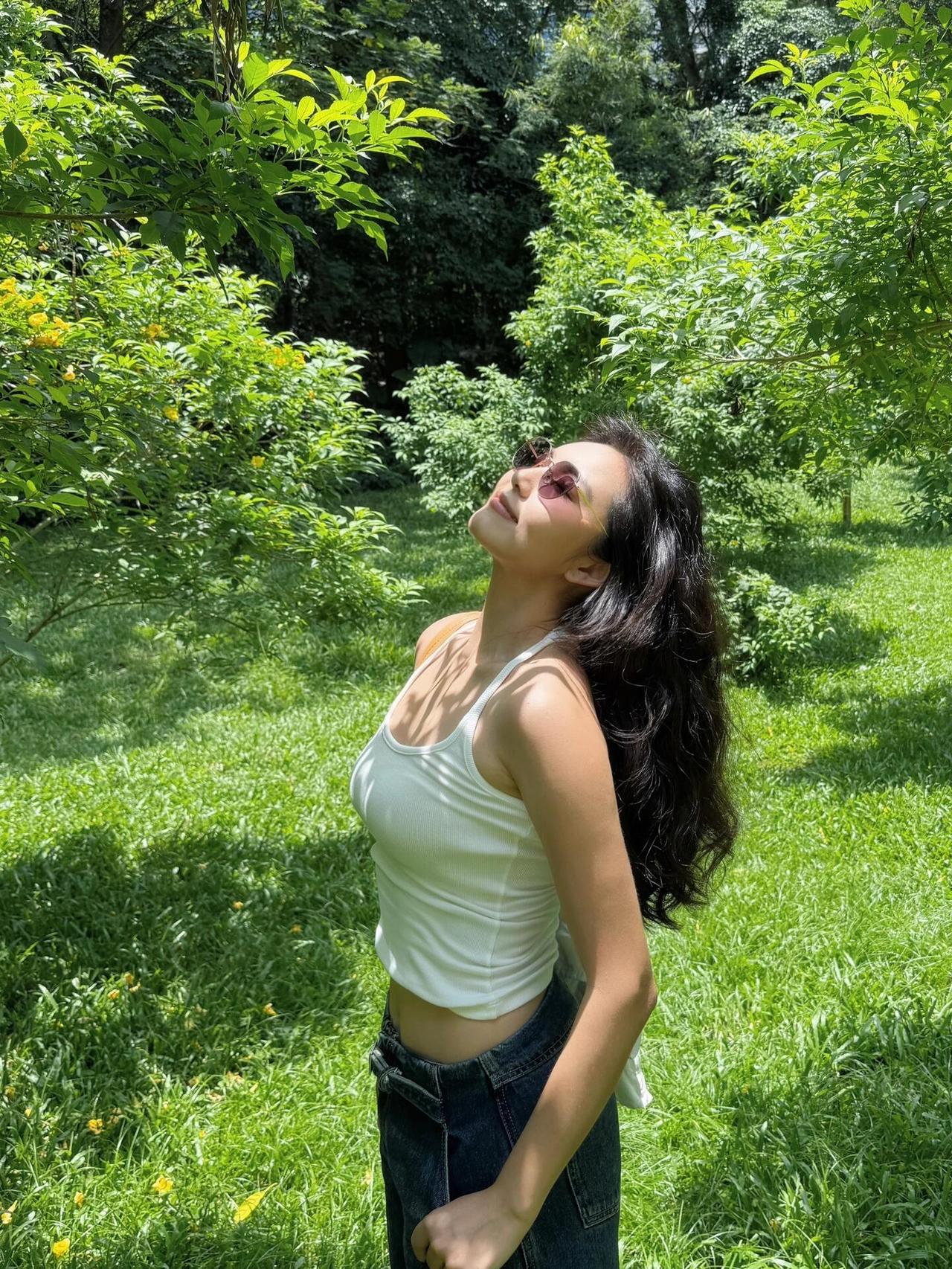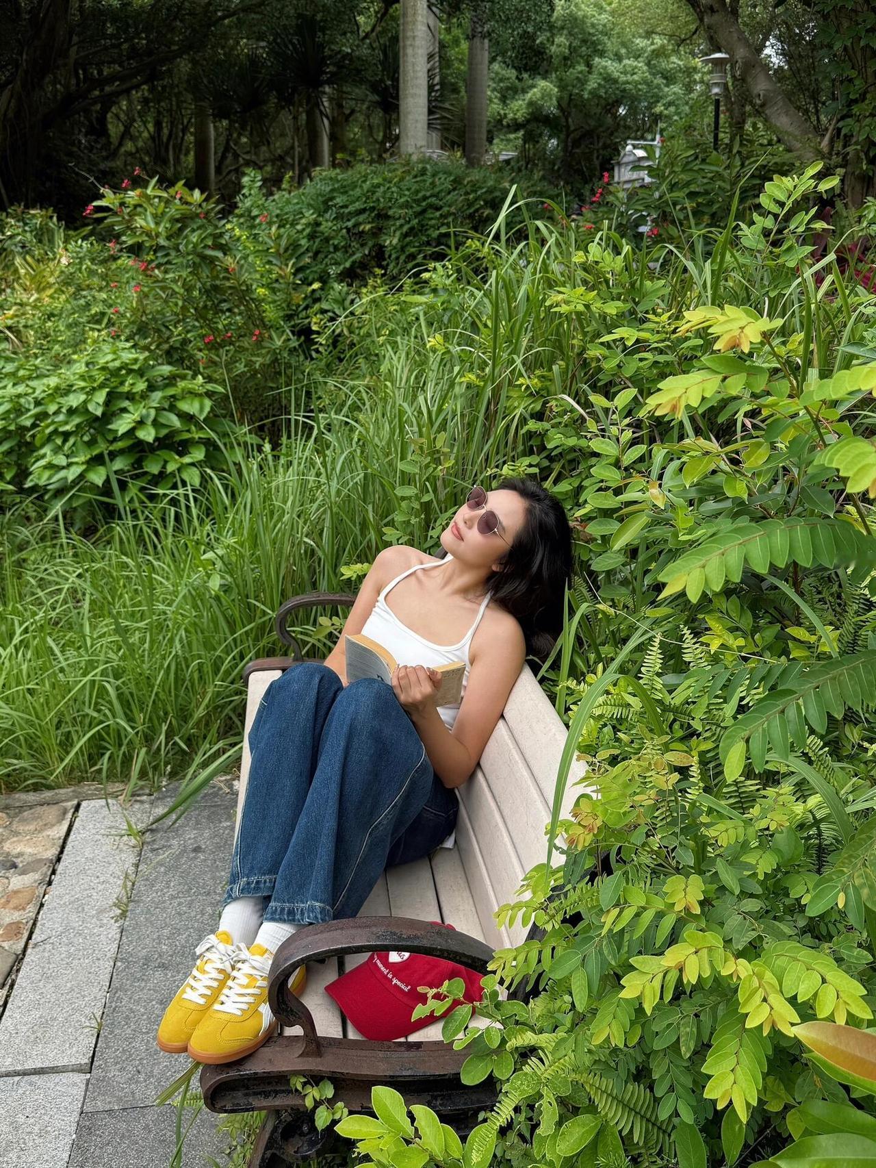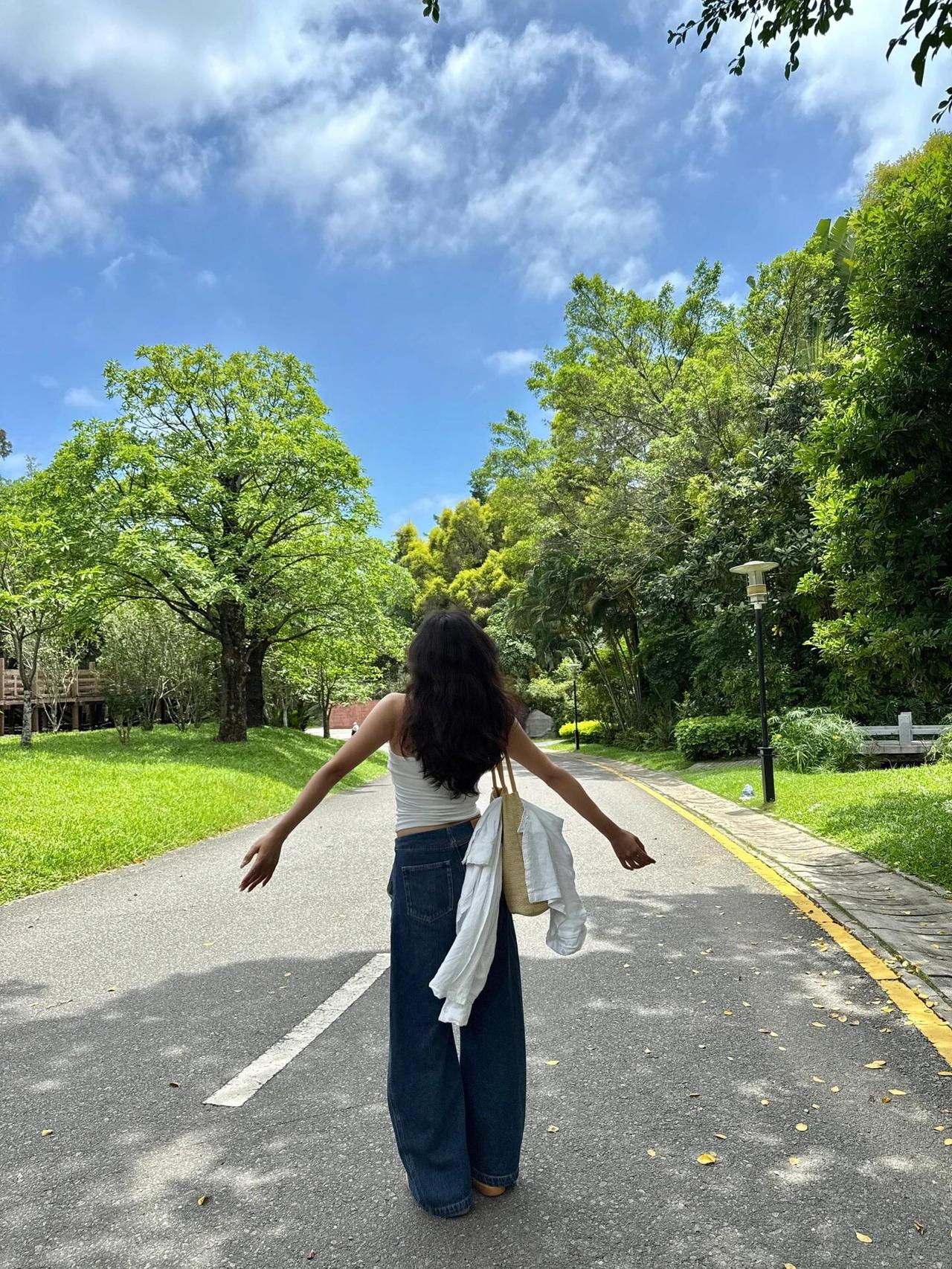 草木间的松弛 白背心裹着盛夏的风,落进草地的柔软里 她躺着,发丝漫过青草地 像漫过一捧不慌不忙的温柔 摊开的书页上,墨镜斜倚着 像倚着一段不肯被追赶的时光 趴在草地上翻书的刹那 帆布鞋的鞋底朝着天光 把细碎的欢喜,晾在枝叶筛下的光斑里 紫花漫过脚踝时,她仰头笑 风裹着草木的香,吻过她的脸颊 所有的紧绷,都被这抹鲜活揉碎 走在林荫道上,她张开双臂 白衫系在包上,像系住一寸轻盈 脚步踩过落满光斑的路 身后的树影晃了晃,晃成温柔的背景 高草没过膝头的瞬间 她仰头接住风,也接住整片山野的松弛 长椅上靠着的模样,是时光的慢 黄球鞋蹭着石阶,书页停在某一行 不必急着赶路,不必凑谁的热闹 只在草木间,做最舒展的自己 让风来,让光来,让欢喜落满衣襟 成了盛夏里,最熨帖的人间米色背心连衣裙 文艺松弛感穿搭 穿裙子的温柔 时光里的温润 田野里的松弛感 文艺松弛感 温柔系背心