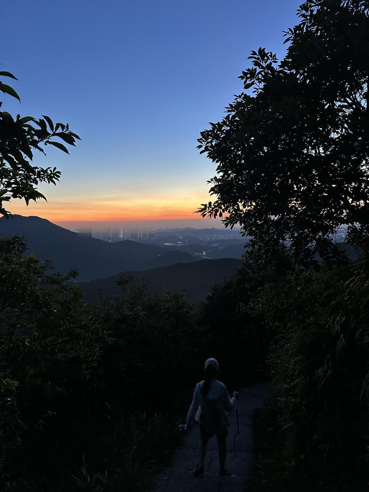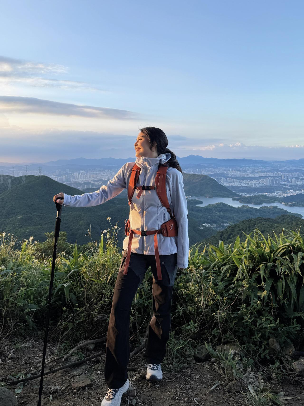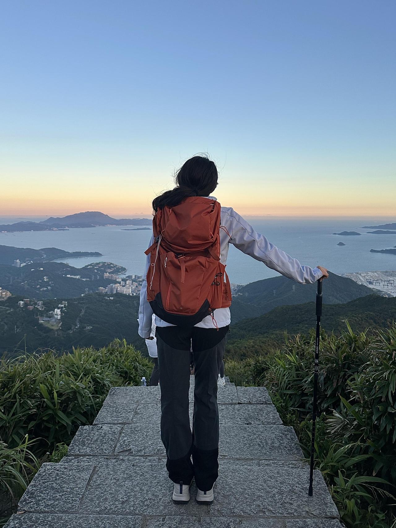 登山杖敲开石阶的晨雾时 风正掠过梅沙尖的草叶 把山海的辽阔,揉进她扬起的笑意里 浅白的冲锋衣裹着山野的风 橙红背包是行囊,也是不肯黯淡的热烈 她站在石阶上,身后是铺展的海 是错落的岛,是城市蜷在山海的褶皱里 发丝被风拂乱的瞬间 她抬手,指向远方的霞光 像指向所有未说出口的奔赴 那些踩着碎石、淌过汗的路 都在登顶的这一刻,成了值得 背靠刻着“梅沙尖”的石碑 她张开双臂,让风灌满衣襟 落日把金辉洒在海面,也洒在她的肩头 山海沉默,却接住了所有勇敢 登顶的意义从来不是终点 是风里的自由,是脚下的路 是站在高处,看见自己 也看见山海,都在为奔赴而温柔