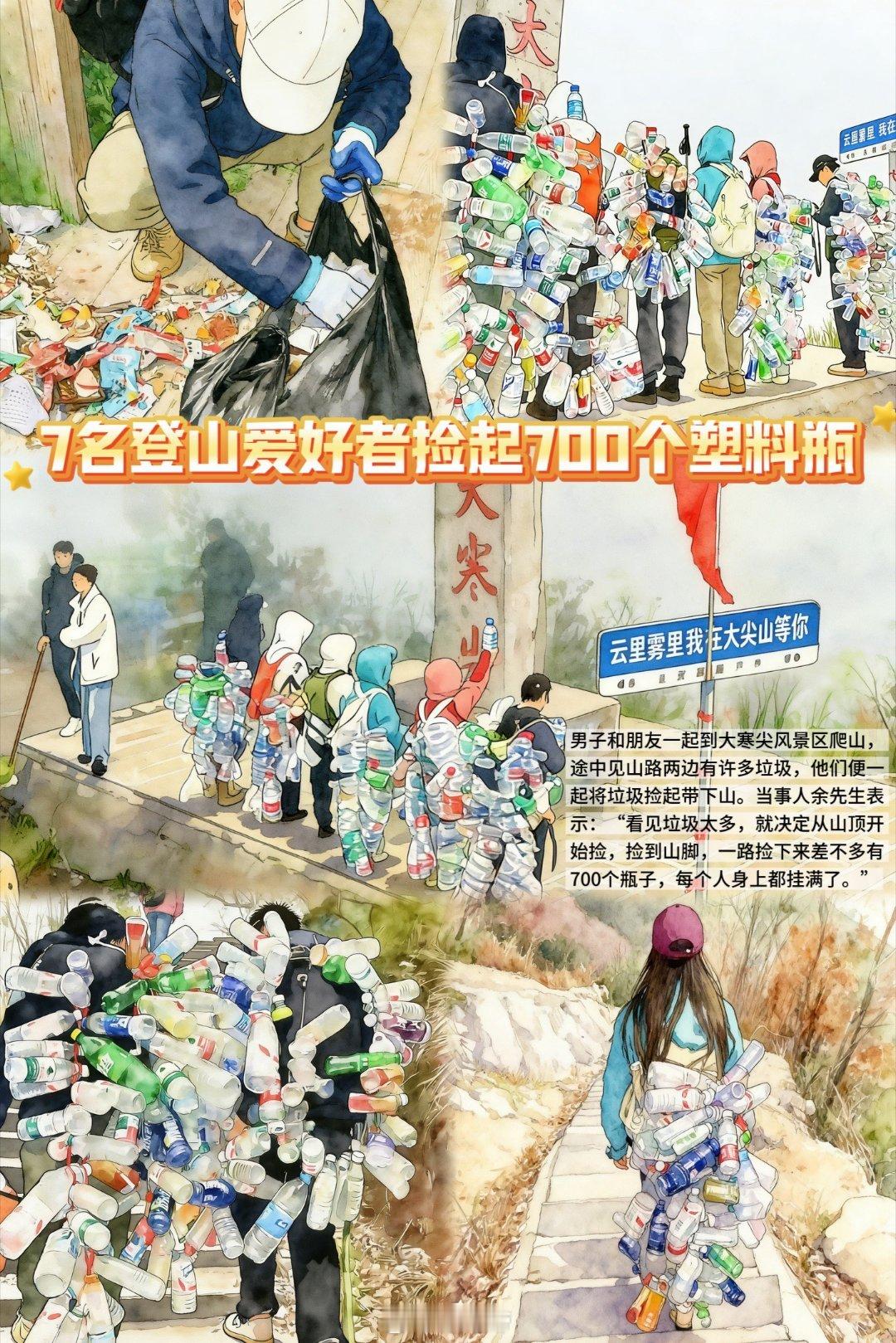 浙江驴友捡700瓶子做成战袍近日,浙江金华。7名登山爱好者化身环保卫士,自发进行“净山”。他们用绳索将沿途捡拾的700多个废弃塑料瓶串联起来,披挂在身,化身为行走的“环保卫士”。网友呼吁:“保护环境,从带走自己的垃圾开始。”八婺同心(来源:义乌市融媒体中心)
