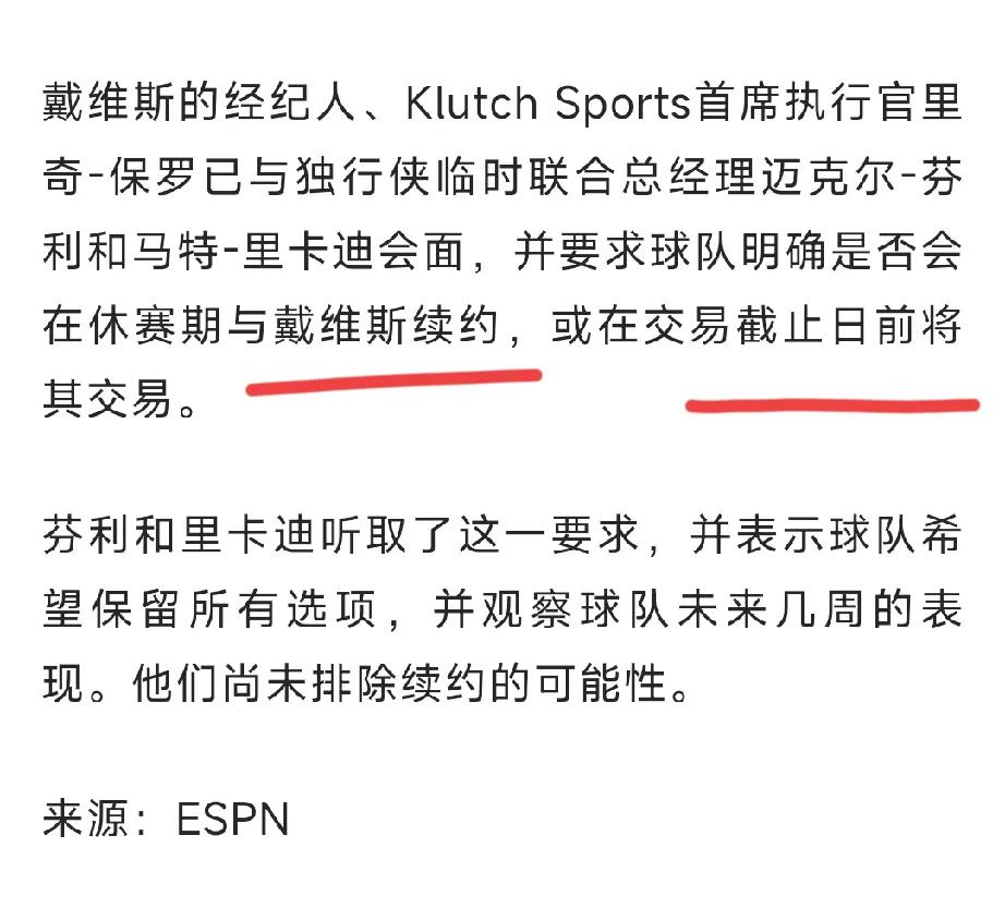 要么交易,要么续约!里奇保罗还真是一个天才经纪人啊,这一招直接把浓眉的身价又提升了一个档次,对独行侠和浓眉来讲,都是有好处的,首先,独行侠肯定是要将浓眉交易出去的,但浓眉来到独行侠的玻璃属性,会让他的交易价值大打折扣,而里奇保罗主动逼宫独行侠,这一行为将让其他球队认为独行侠迫不得已交易浓眉的,所以独行侠收货的交易价值可能会比预期的高一些!